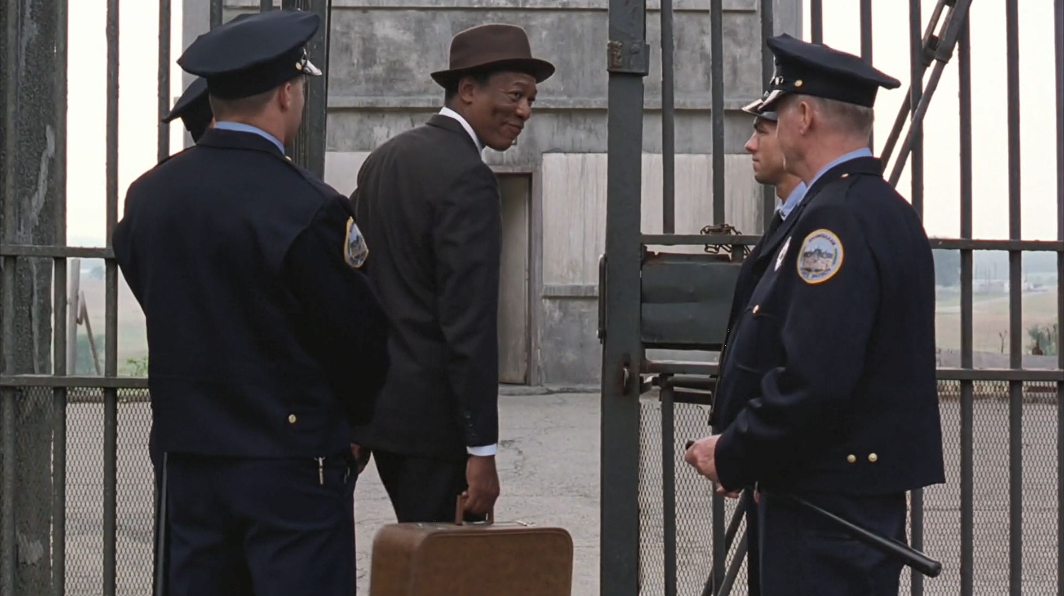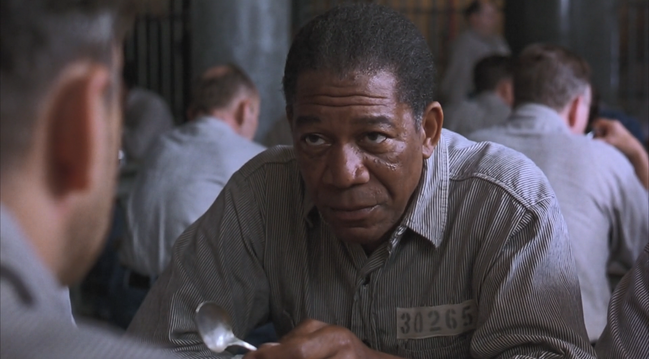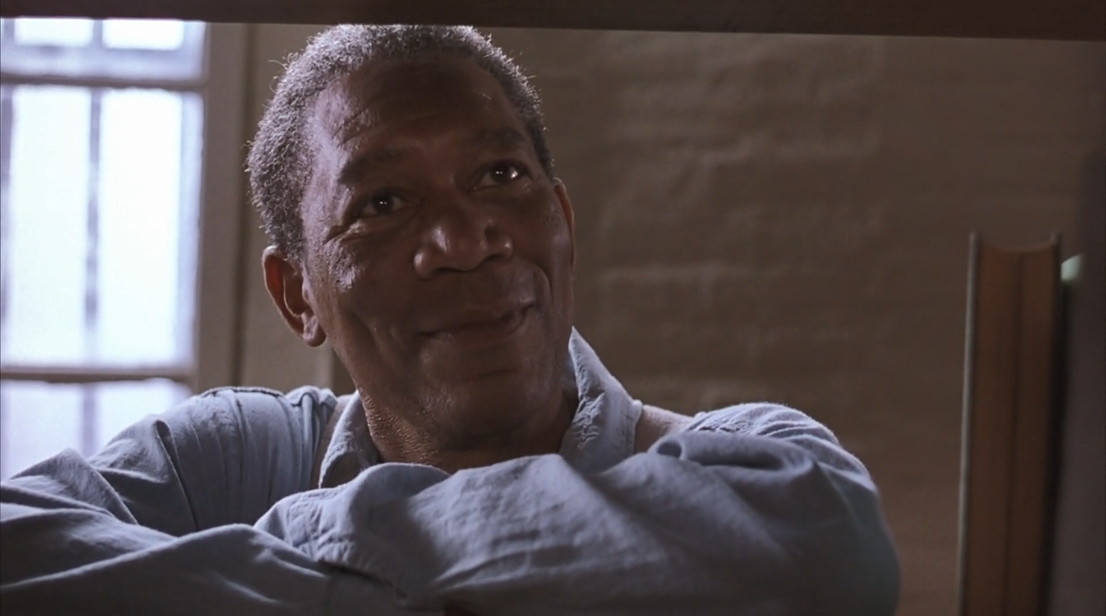 레드는 이 영화의 내레이터이자 쇼생크 감옥의 터줏대감으로서 신출귀몰한 물자공급원의 역할을 맡고 있다. “담배, 마리화나, 애들 졸업 축하주도 구할 수 있죠. 뭐든지 구할 수 있습니다. 그래요. 인간 백화점이죠. 듀프레인이 와서 영화배우 사진을 구할 수 있냐고 물었을 때도 문제없다고 했지요. 듀프레인은 아내와 정부를 죽인 죄로 1947년 쇼생크 감옥으로 왔습니다. 전직 은행 부지점장이었죠.” 듀프레인이 쇼생크에 입성하던 날, 죄수들은 새내기 죄수들을 향해 내기를 한다. ‘신참 죄수들 중에서 누가 먼저 울음을 터뜨릴까’에 내기를 거는 것이다. 감옥에서는 현금보다도 소중한 담배를 저마다 내기의 판돈으로 걸며 키득거리는 고참 죄수들. “처음에 듀프레인은 제게 강한 인상을 주지 못했습니다. 바람만 불어도 날아갈 것 같았죠. 그게 제 첫인상이었습니다.” 레드는 아무도 담배를 걸지 않은 ‘꺽다리 귀공자’ 앤디 듀프레인에게 담배를 무려 10개비나 건다.