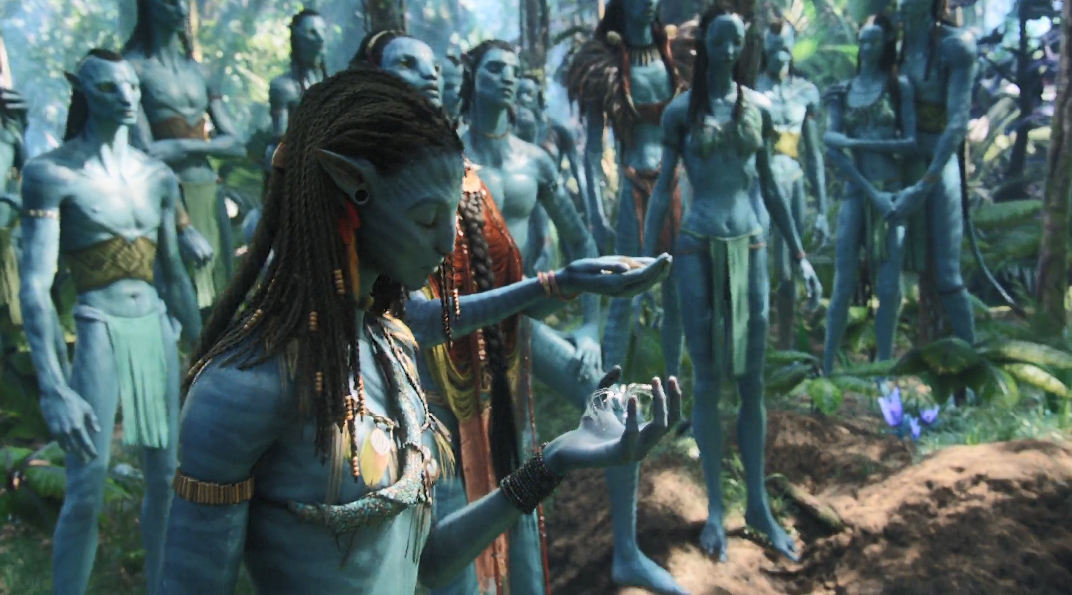 나비족의 샤먼이자 네이티리의 어머니인 모앗은 온힘을 다해 그레이스 박사를 살려보려 하지만 시간이 너무 부족하다. 모앗이 부족 전체가 모인 가운데 치유의 의식을 주관하는 모습은 영화 『아바타』 최고의 장엄한 스펙터클을 연출한다. 한 사람을 살리기 위해 부족 전체가 한 자리에 모여 간절히 기도하고 노래하는 모습, 천상의 존재와 지상의 존재를 연결하게 하는 샤먼의 거부할 수 없는 위엄. 특히 3D 영상이 연출하는 생생한 현장감에 도취된 관객들은, 자신도 모르게, 한 사람도 빠짐없이 서로 어깨를 걸고 단 한 사람의 치유를 위해 기도하는 나비족의 일원이 된 듯한 행복한 착시에 빠진다. 우리도 저 수많은 손들 중 하나를 잡고 싶은 마음, 우리도 그녀의 치유를 위해 기도하고 싶은 마음이 된다. “그녀가 부족의 일원으로 다시 걷게 해주소서…….”