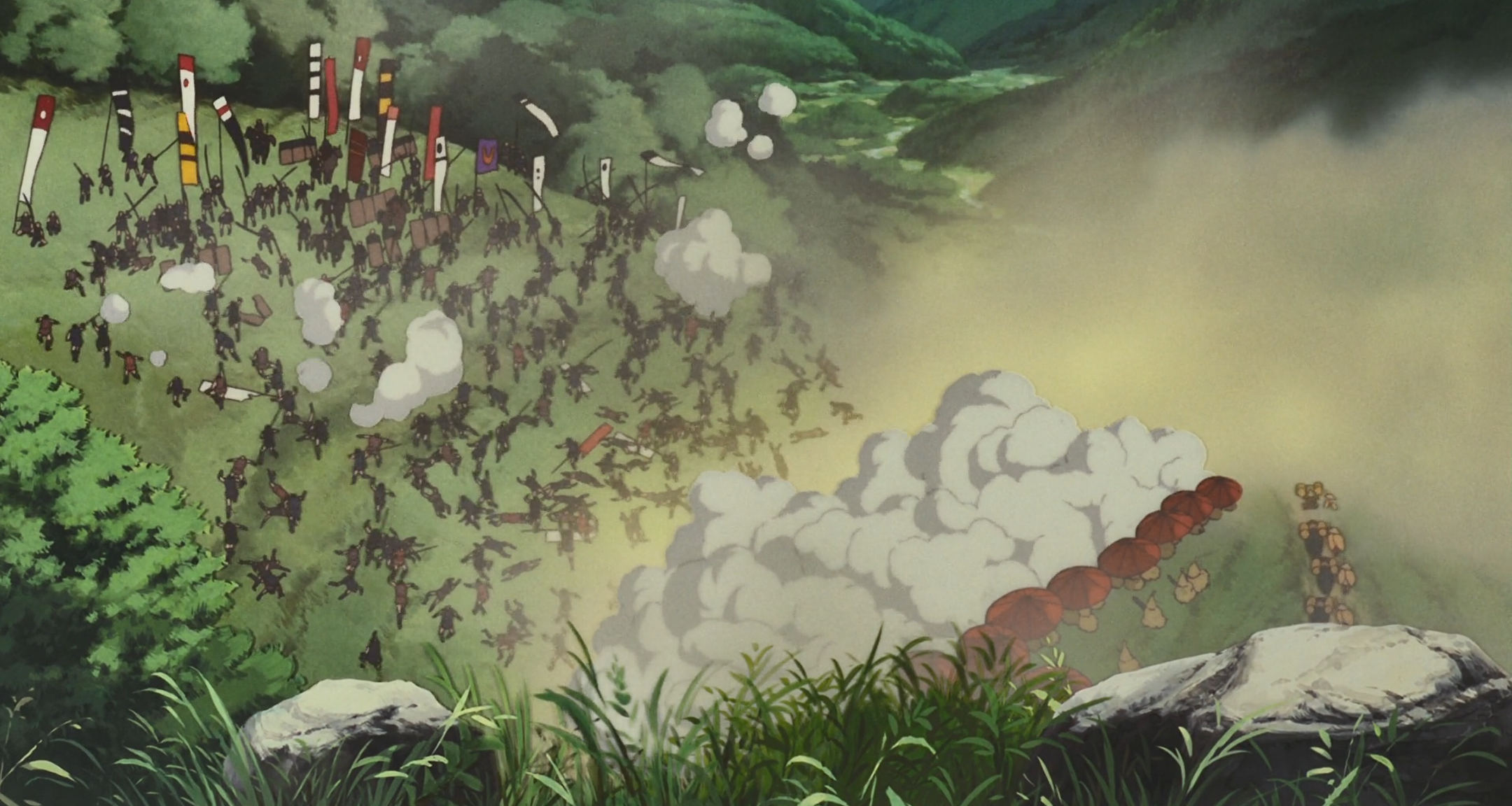 이제 전쟁은 피할 수 없는 현실이 된다. 인간들은 총포와 화약 뒤에서 자신의 몸을 안전하게 숨긴 채 멧돼지와 들개들의 목숨을 노리고 있고, 모로와 원령공주를 비롯한 들개들과 멧돼지 군대는 목숨을 걸고 총력전을 각오한 채 적진으로 달려간다. 에보시는 그녀의 재산과 땅을 노리는 사무라이들에게, 그리고 시시신의 목을 노리는 국왕에게 ‘이용’당하고 있는 것을 모르고 있다. 짐승보다 숲보다 더 큰 적은 인간이라는 것을, 그녀와 ‘비슷한’ 재화를 노리는 경쟁자들이라는 것을, 그녀는 아직 모른다. 그러나 안다 해도 결과는 달라지지 않았을 것이다. 그녀의 목표는 ‘자연의 자원화’이기에.