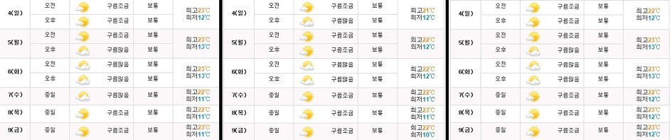 ▲ 왼쪽부터 대구, 청주, 서울의 일주일간 날씨다. 우리가 가야 할 주요 길목이라 할 수 있는데 다행히 비 예보는 눈꼽만치도 없다.