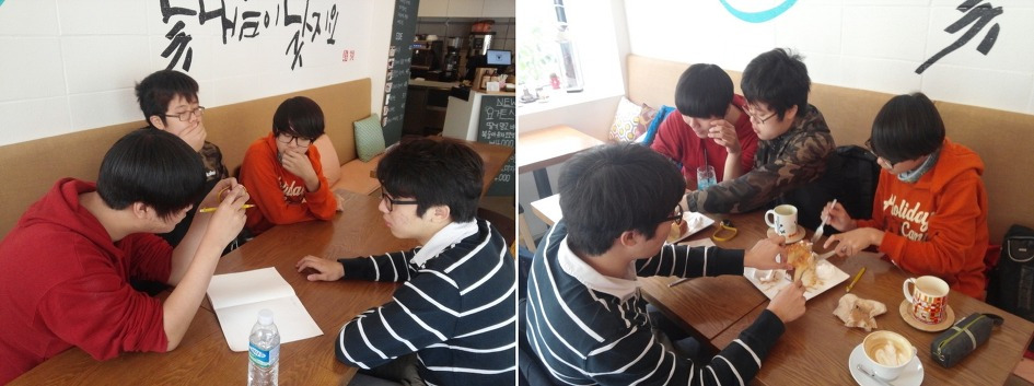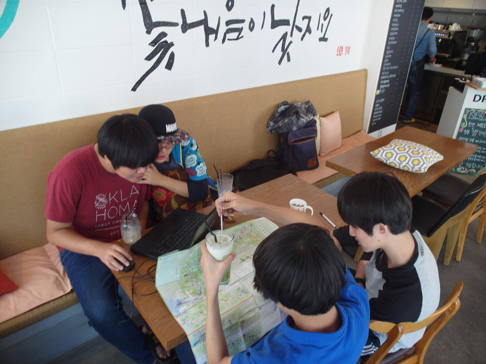 민석이와 준영이는 전체 달려야 할 킬로미터를 6일로 나누어 60km당 머물러야 할 장소를 먼저 정했다. 재익이와 현세는 컴퓨터를 가지고 민석이가 정해둔 곳에 숙소가 있는지를 찾았다. 하지만 별로 자신이 해야 하는 일에 대한 책임감은 없어 보였다. 자꾸 딴 짓만 하고 있었기 때문이다. 카페에서 보낼 수 있는 시간은 2시간이었는데, 급할 것은 없었기에 보채지는 않았다. 어떤 식으로든 자신들이 맡은 책임을 다 해야 하고, 이런 식으로 딴 짓을 하며 시간을 보내고 난 후엔 개인시간을 빼서라도 책임을 다해야 하기 때문이다.