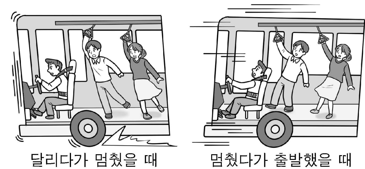 | ‘(㉠)’은 ‘습관’이라는 뜻이 있어. 원래 상태를 유지하려 한다는 의미로도 사용합니다. 그래서 이 글자 뒤에 ‘性’을 결합하면 ‘물체가 외부의 힘을 받지 않는 한 그대로 머물러 있거나 계속하여 움직이려는 성질’을 뜻하는 말이 됩니다. 이 그림이 우리가 흔히 경험할 수 있는 예입니다. |