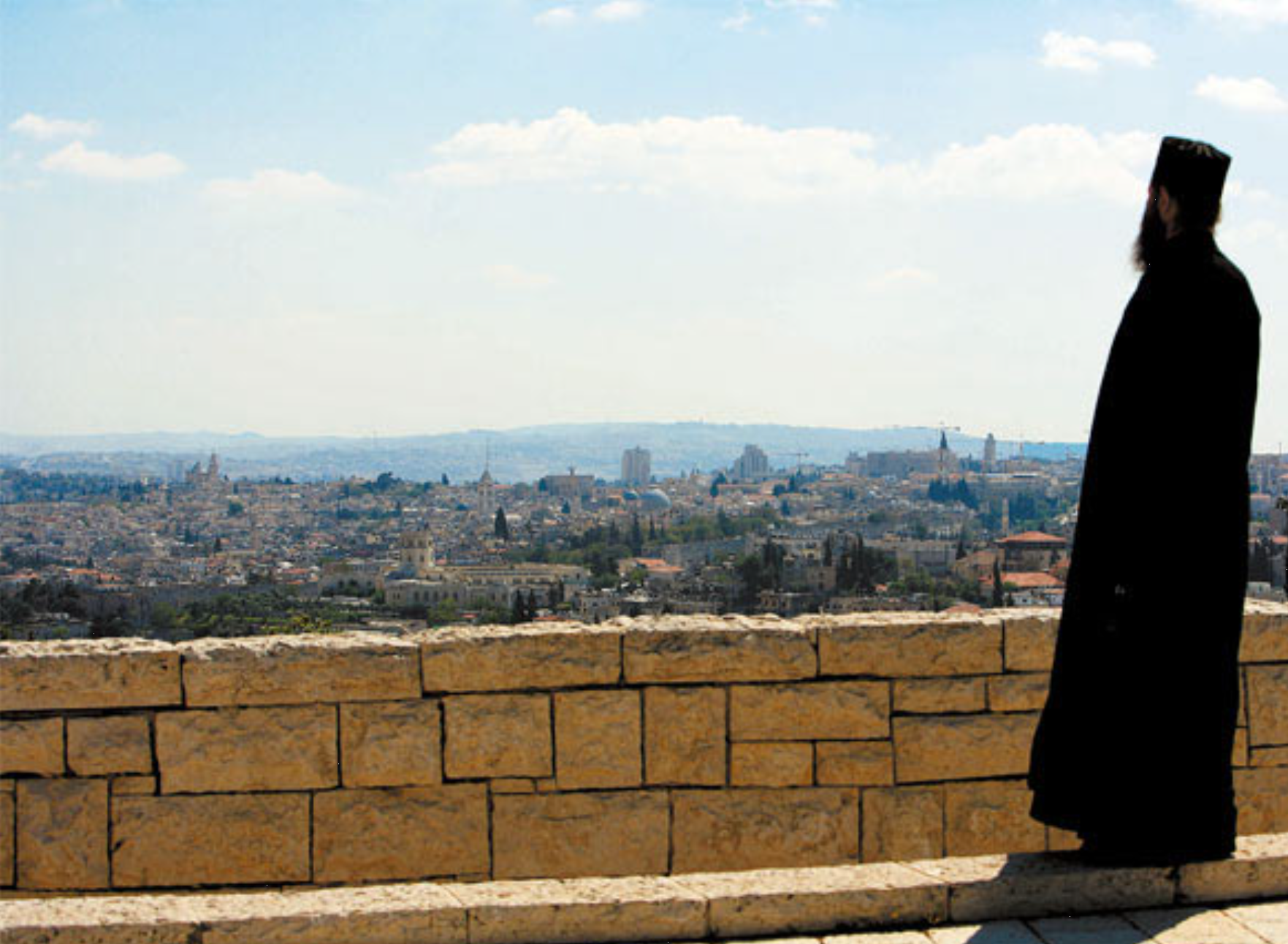 ▲ 히브리 대학교정에서 예루살렘을 바라보는 희랍정교회 신부, 이 신부는 히브리대학에서 구약학 박사 과정을 밟고 있었는데, 기독교의 대세를 아르메니아정교회, 희랍정교회, 가톨릭으로 삼분하였다. 왜 프로테스탄티즘은 포함시키지 않냐고 묻자, 그것은 어디까지나 가톨릭 집안 내의 문제일 뿐이라고 일축하였다. 그리고 가톨릭은 후대의 이방문화전통이 마구 삽입된 비정통의 기독교집단이며, 초기 기독교 사도들의 전승을 제대로 지키고 있는 것은 아르메니아정교회와 희랍정교회일 뿐이라고 못 박았다. 여기 감람산에서 내려다 보이는 이 예루살렘에 야고보의 교회가 있었을까?