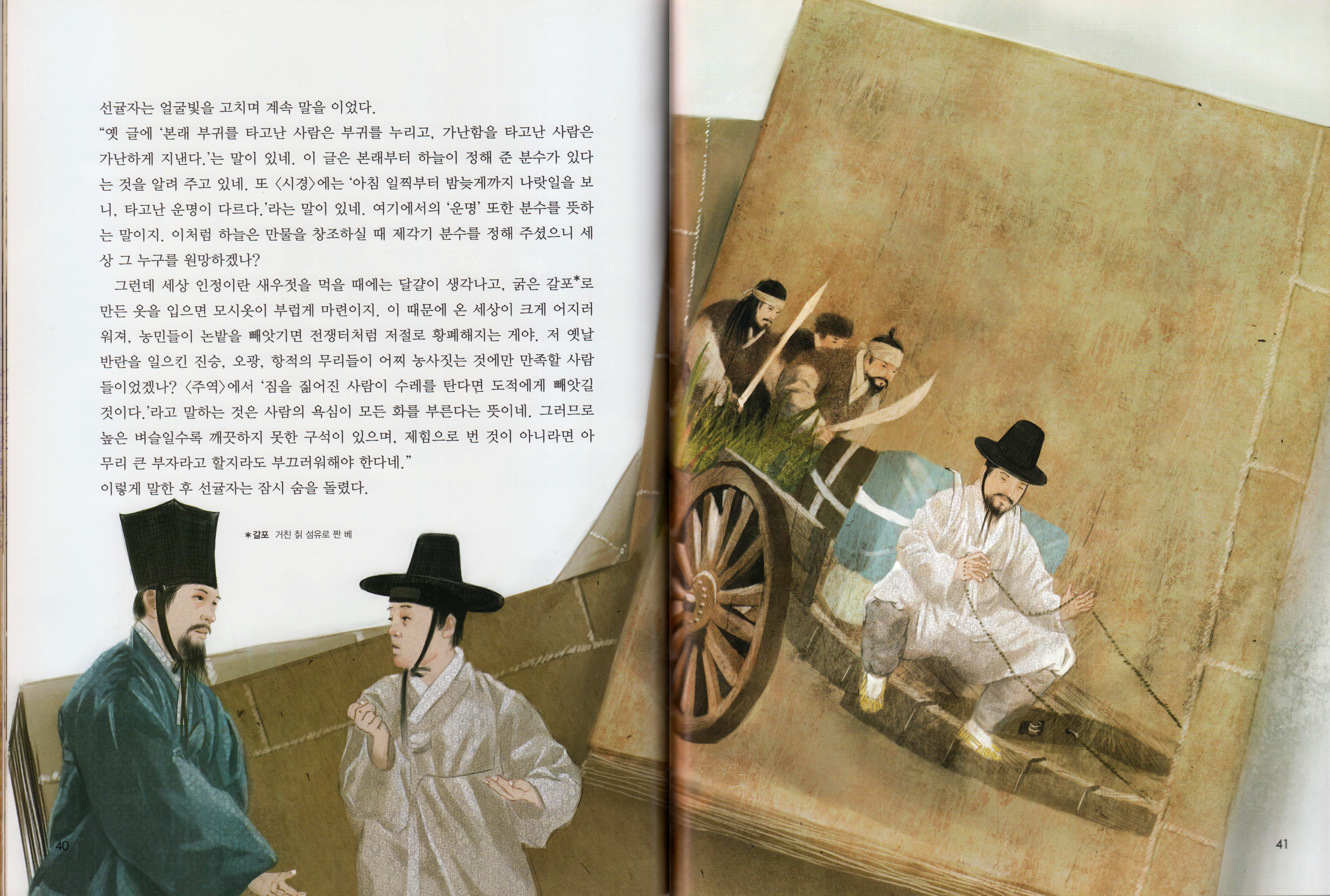 취객 이야기를 마무리하면서 장자는 말합니다. “술에서 온전함을 얻은 저 사람도 이와 같은데, 자연에서 온전함을 얻는 경우는 말해서 무엇하겠는가!” ‘술에서 온전함을 얻은 사람’이 술에 취한 채 수레에서 떨어진 대인을 가리킨다면, ‘자연에서 온전함을 얻는 사람’은 자기 주인과 함께 맨정신으로 떨어진 소인을 가리킵니다. 자연으로 번역한 천(天) 개념은 인위로 번역되는 인(人) 개념과는 대조됩니다. 그러니까 이 경우 자연이나 천은 우리 인간에게 주어진 삶의 역량과 아울러 주어진 타자적 상황을 가리킵니다. 결국 ‘자연에서 온전함을 얻었다’는 말은 마음의 역량이 몸의 역량과 함께하고, 나아가 몸이 마주치는 타자들과 함께한다는 것, 간단히 말해 마음이 신의 상태에 있게 되었다는 의미입니다. 그래서 장자는 말합니다. “성인(聖人)은 자연에 품어져 있기에, 그를 해칠 수 있는 것은 없다”고 말입니다. 노면의 요철을 따르는 수레, 수레를 끄는 말, 수레에 타고 있는 몸, 말의 고삐를 잡고 있는 손 등이 모두 푹신한 침구처럼 소인을 편하게 만드는 장면을 떠올려보세요. “자연에 품어져 있다”는 장자의 말이 쉽게 이해가 될 겁니다. 여기서 자신이 일방적으로 수레를 몬다는 의식은 없습니다. 자신이 수레를 모는 것만큼 노면도 말도 고삐도 수레를 몰고 있는 셈이니까요. 물론 그럼에도 소인은 드문 일이겠지만 수레에서 떨어질 수도 있을 겁니다. 그럼에도 다른 사람이라면 죽었을 상황에서도 소인은 부상만 입을 것이고, 다른 사람이라면 부상을 입었을 상황에서도 소인은 먼지를 툭툭 털며 일어났을 겁니다. 그러니 소인은 얼마나 근사합니까. 이제 대인이 아닌 소인에게서 성인을 발견하려 는 장자의 속내가 보입니다. 소인은 마음으로도 몸으로도 앞으로 끈덕지게 나아가는 진정한 강자니까요.
