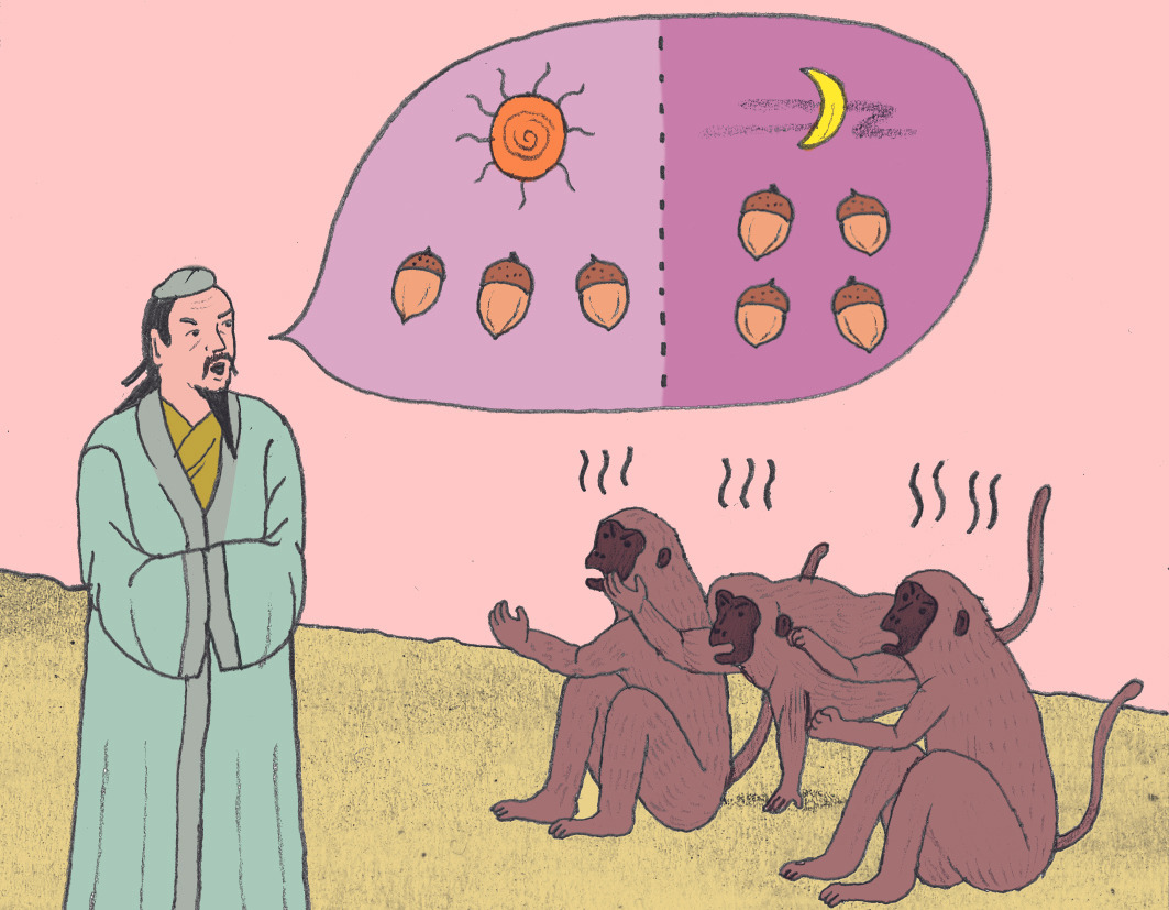 狙公賦芧曰: “朝三而暮四.” 衆狙皆怒; 曰: “然則朝四而暮三.” 衆狙皆悅. 名實未虧而喜怒爲用, 亦因是也.