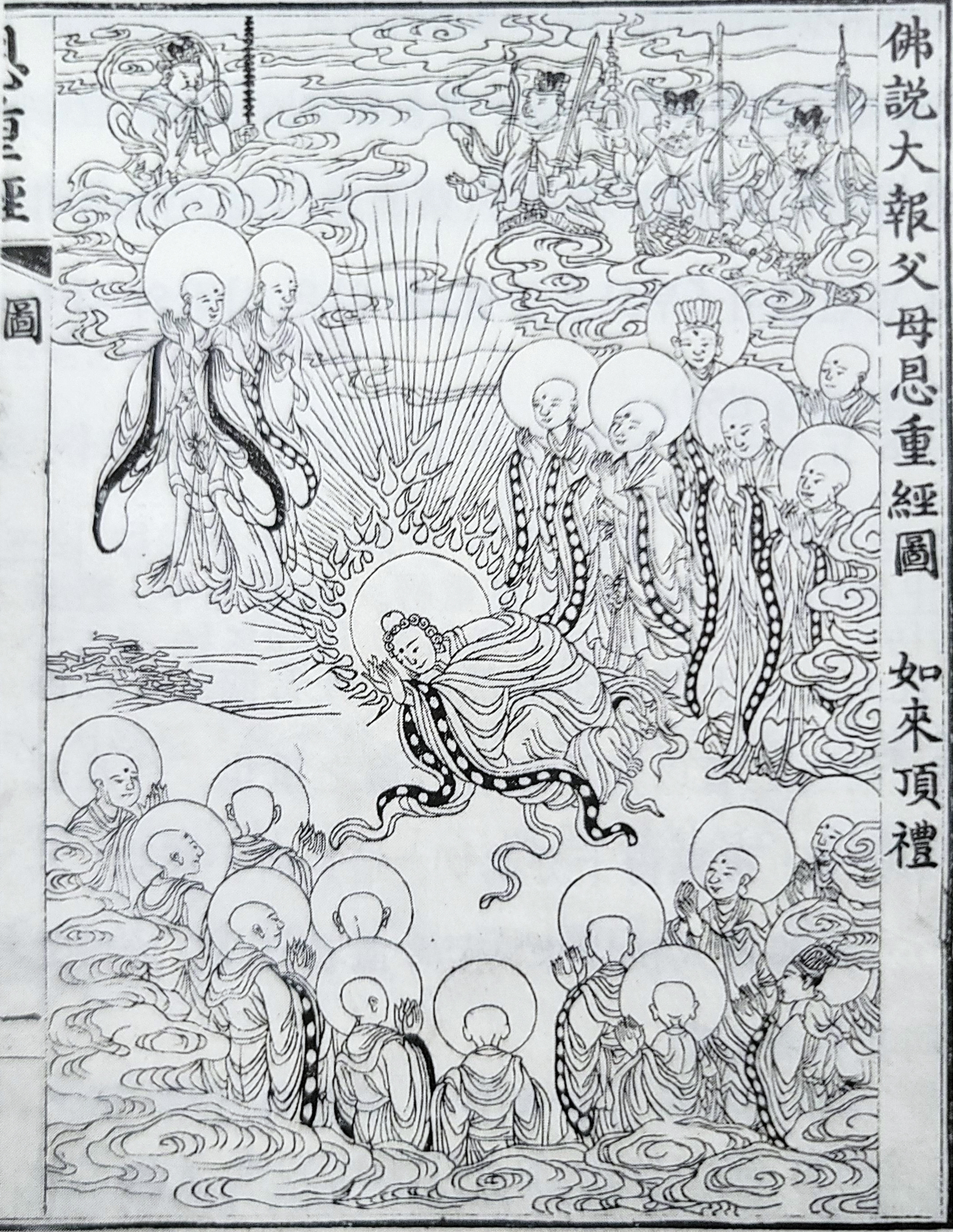 ▲ 용주사 『은중경』의 첫 판화 「여래정례(如來頂禮)」. 가운데 세존이 오체투지를 하고 있고 그 앞에 마른 뼈[고골枯骨]가 놓여 있는 것이 보인다. 자세히 뜯어보면 단원의 표현력이 섬세하다.