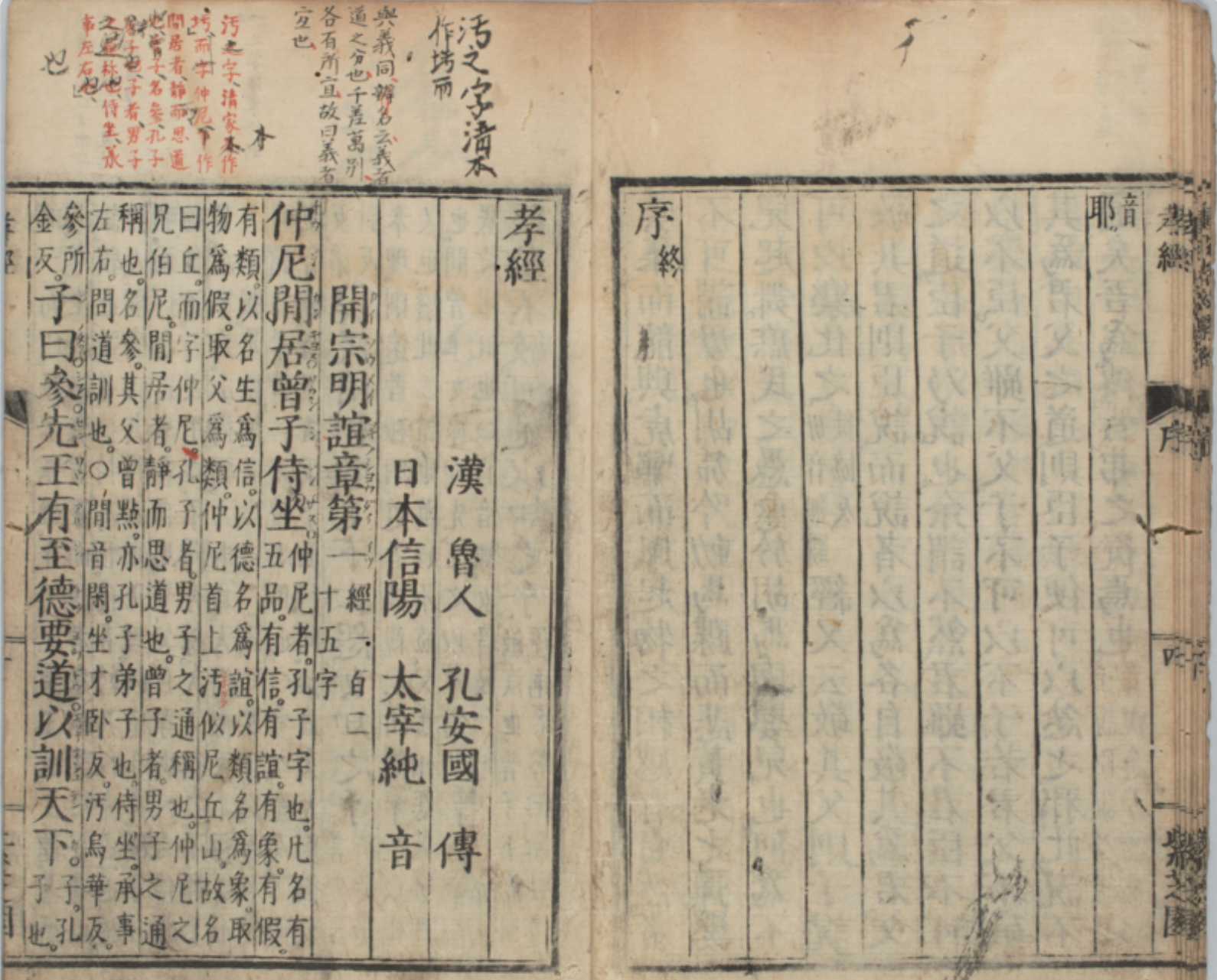 그리고 전한 무제(武帝)의 시기에 노나라의 공왕(恭王)이 공자의 구택(舊宅)을 헐었는데, 그 벽 속에서 『효경(孝經)』이 나왔는데, 이것이 과두문자로 쓰여진 것이고 22장으로 되어 있었다고 한다. 이것이 고문효경이다. 이 고문효경에 공안국(孔安國: 한 무제 때의 사람)이 전(傳: 이 경우 주注와 같은 개념이다)을 달았다고 한다. 그리고 금문효경은 후한 때에 정현(鄭玄, 127~200)이 주(注)를 달았다고 한다. 그러니까 ‘공안국전’이라고 하면 고문효경을 가리키는 것이고, ‘정현주’라고 하면 금문효경을 가리키는 것이다.