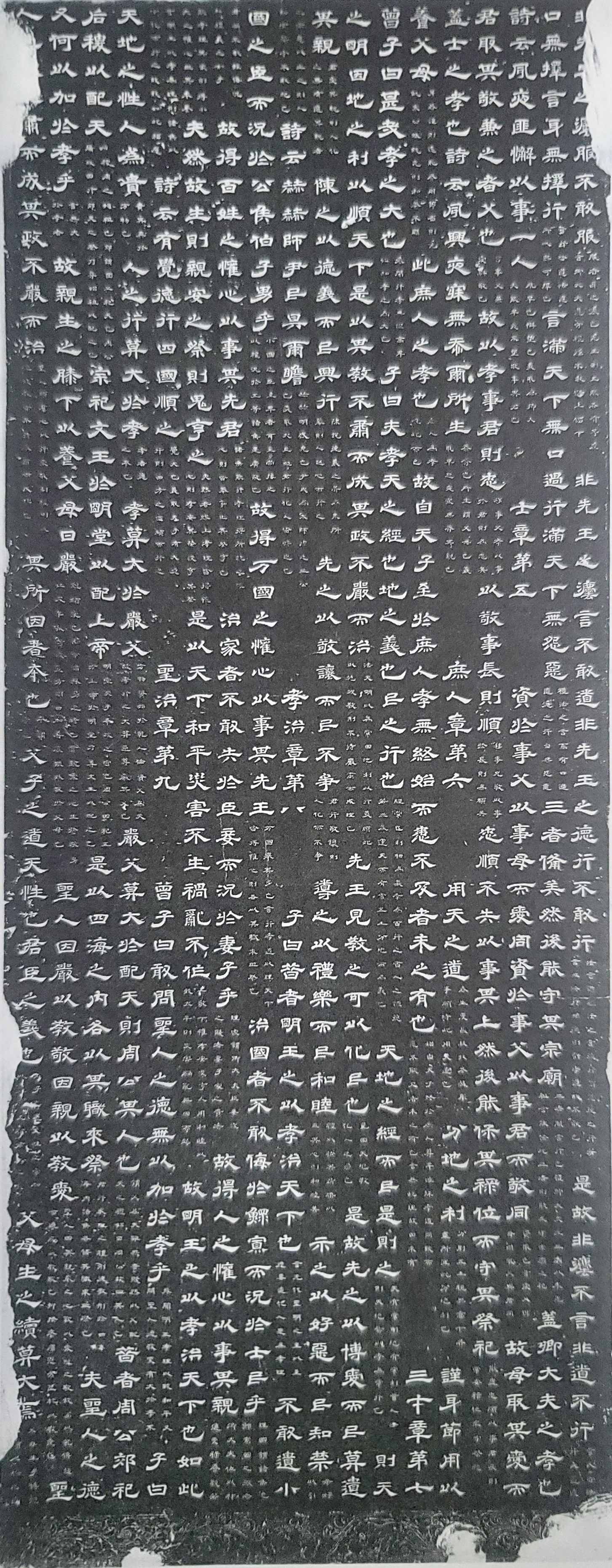 ▲ 서안(西安) 비림박물관(碑林博物館)의 석대효경비(石臺孝經碑) 탁본, 2008년 서울역사박물관에서 전시됨. 620x132cm, 경대부장(卿大夫章)부터 성치장(聖治章)까지 보인다. 서울역사박물관 자료제공
