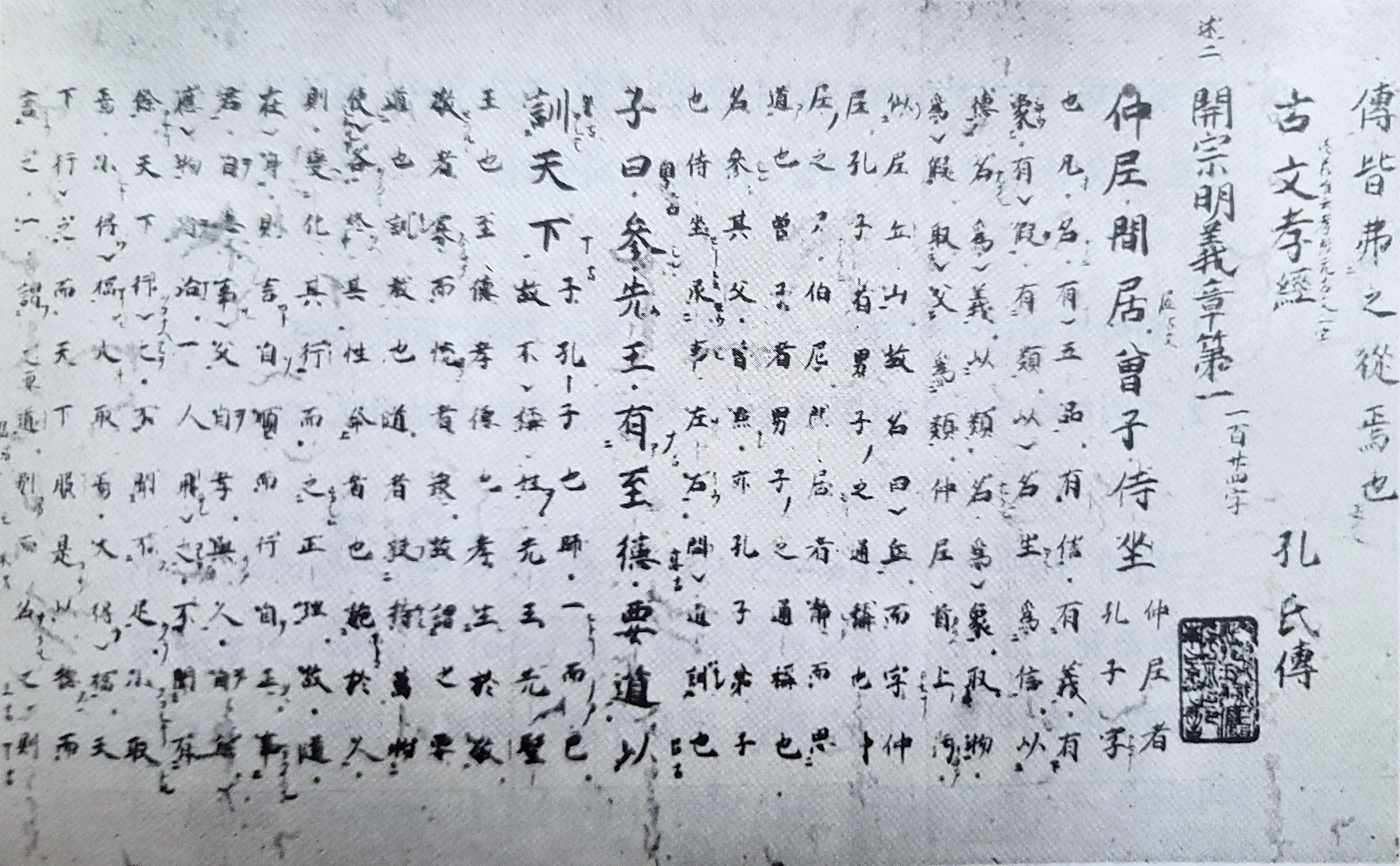 공안국이 『고문효경』의 전(傳)을 짓게 된 경위를 설명하고 있다. 경(經: 주서朱書)과 전(傳: 묵서墨書)의 모습에 관해서는 실제로 우리나라 국립중앙도서관 컴퓨터 ‘자료찾기(Data Search)’에 들어가 ‘청가정본(淸家正本)’을 찾아볼 것. 색은 구분 안 되어도 경과 전이 구분되는 모습은 확인할 수 있다.