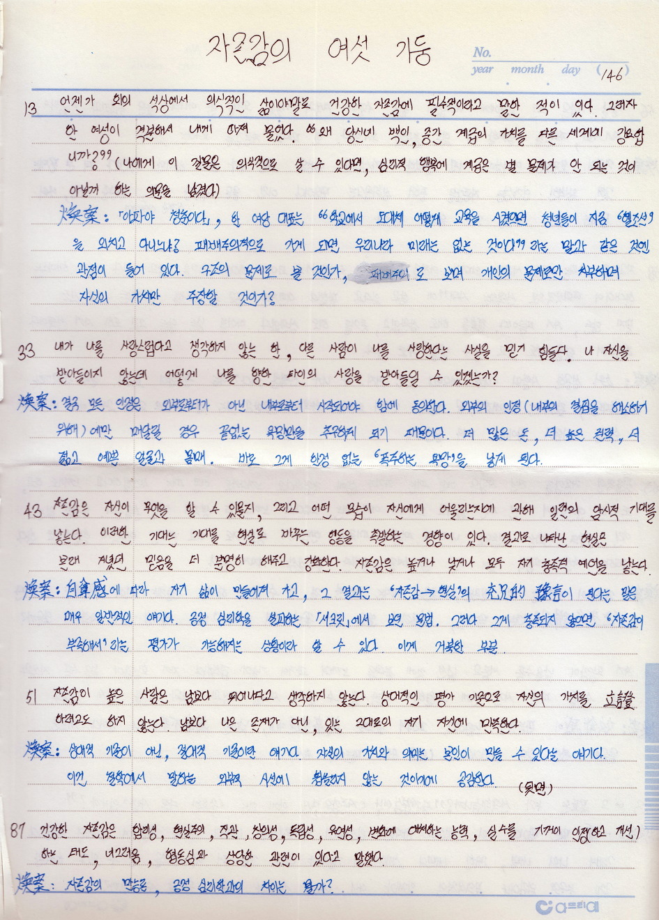 ‘자기존중감’이라는 것은 ‘나는 훌륭하다/나는 잘 났다’와 같은 ‘자기 인식’이 아니라, 즉 자족적인 것이 아니다. ‘나는 살지 않으면 안 된다’, ‘나는 하지 않으면 안 되는 일이 있는데 그것은 나 외의 어느 누구도 대체할 수 없다’와 같은 ‘타자’와의 관계에서 싹트는 것이다.