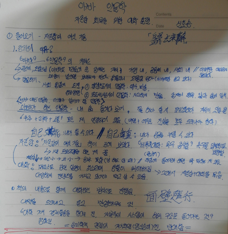 드디어 신호승 선생님의 ‘자존감 회복을 위한 대화 훈련’의 1강이 시작되었다. 오늘은 특별히 준규샘 사모님까지 함께 해서 더욱 신나는 시간이었던 듯하다. 담주에도 뵐 수 있음 히트다 히트!