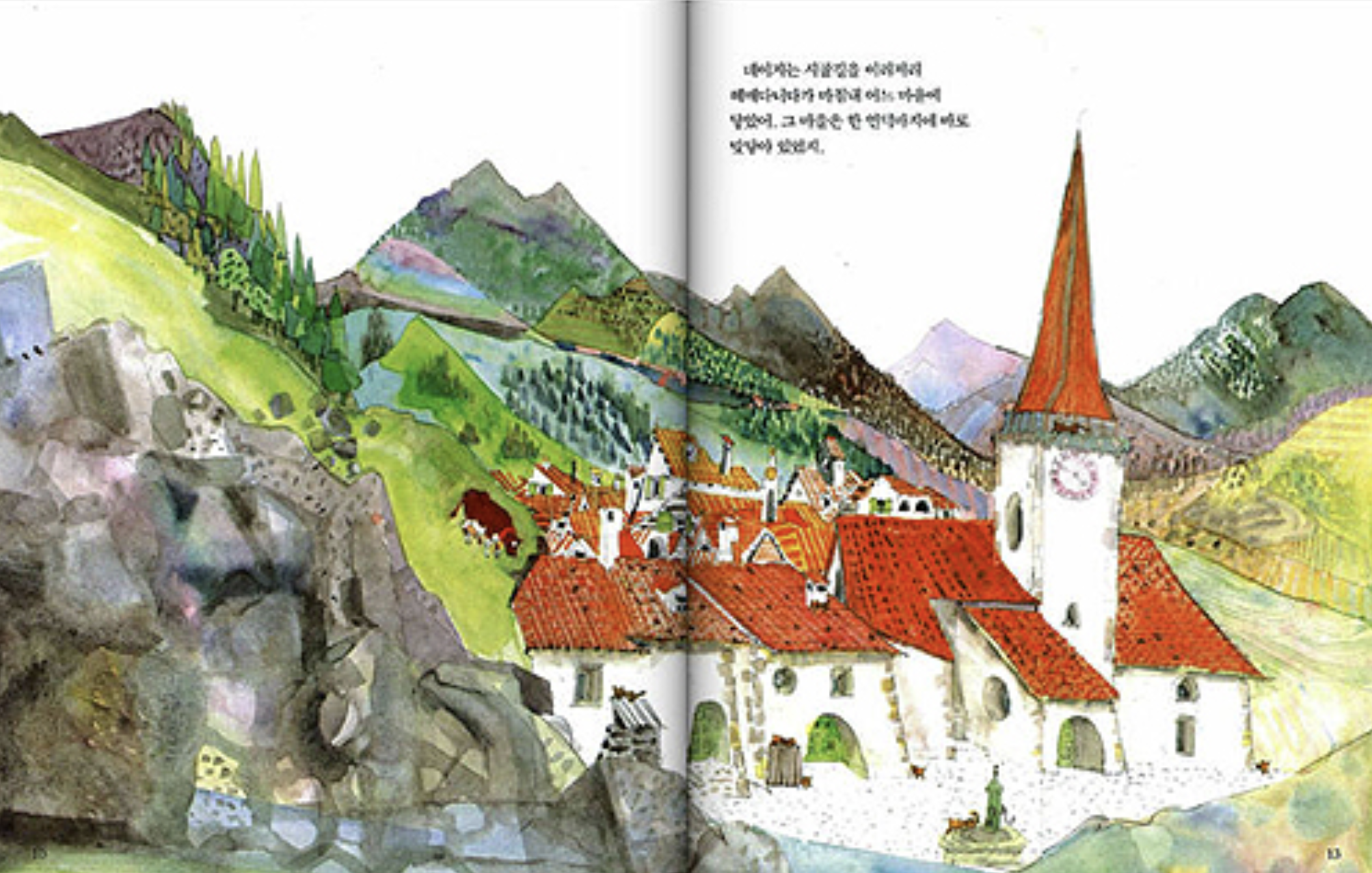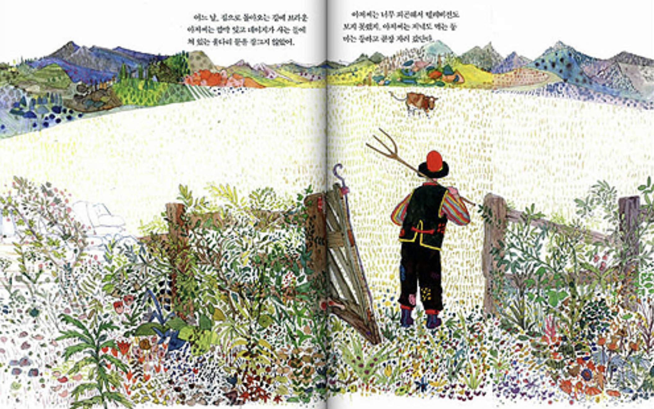 왼쪽의 표지 그림을 보세요. 화려한 색채로 칠해진 경비행기의 날개 위에 암소 한 마리가 올라가 있지요. 그런데 눈썰미가 좋다면 뒷좌석에 앉아 이 암소를 촬영하는 카메라를 든 남자도 찾아내셨을 겁니다. 표지의 그림은 어른 책이든 아이 책이든 간에 책이 전달하고자 하는 메시지를 강력하게 표현해 내야만 합니다. 혹은 책 속의 내용을 독자로 하여금 궁금해서 못 배기게 해야 하지요. 빨강 지붕이 알록달록하고 초록과 노랑으로 물이 오른 구릉 위를 비행하는 저 비행기가 향하는 곳이 어디일까요? 우선은 이런 호기심에서부터 출발하도록 해봅시다.
