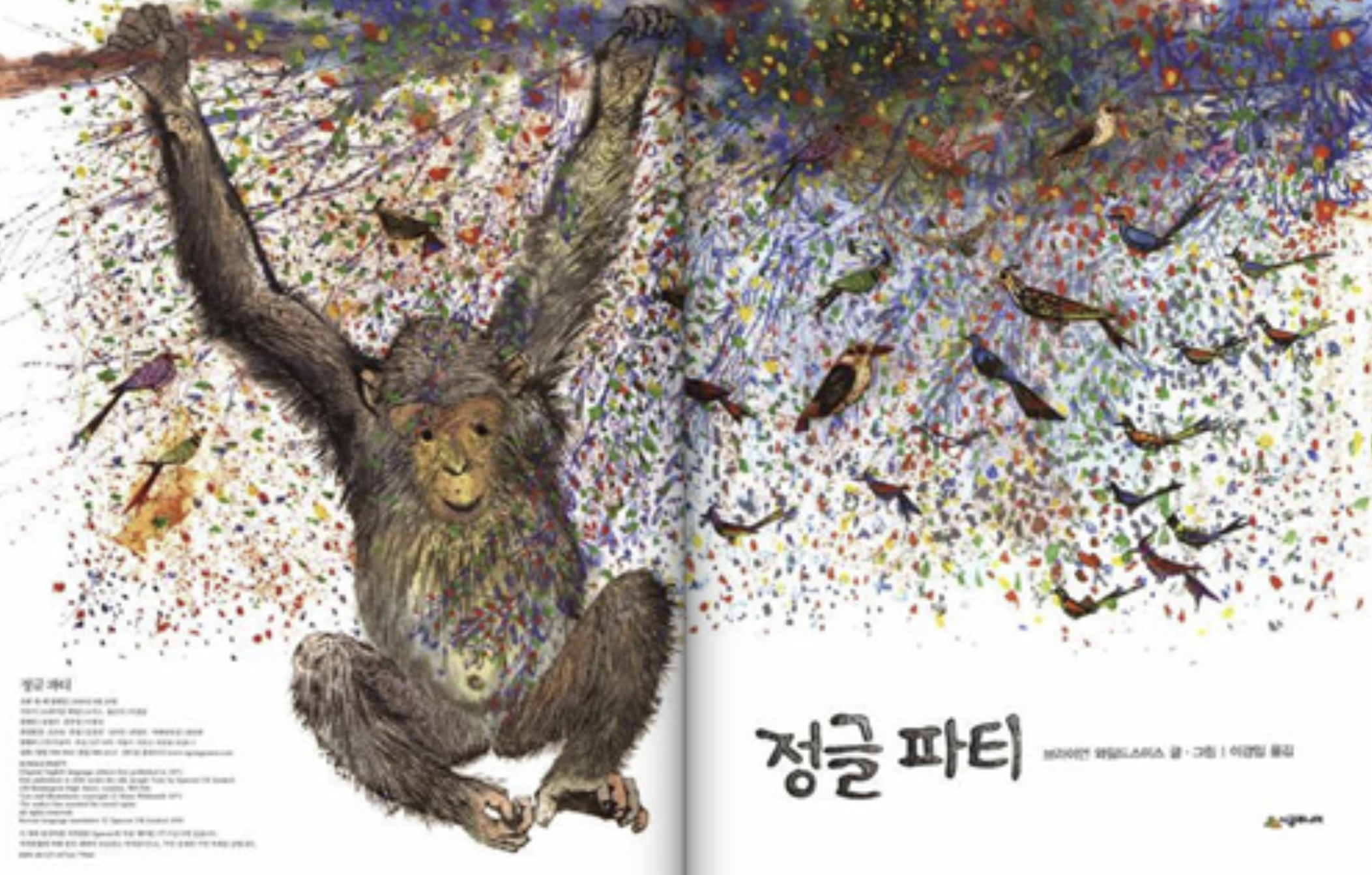 이 작품은 평범한 우화가 와일드 스미스에 의해 환상적인 이야기로 거듭남을 보여 주는 걸작 중의 걸작입니다. 동물들 하나하나에 주어진 자유분방한 색채는 그 자체로 살아있는 듯 섬세하고 생생합니다. 또한 작가의 상상력을 통해 구현된 파티에서 펼치지는 동물들의 묘기도 무척이나 독특합니다. 멜론을 굴리며 걸어가는 하이에나라든가, 표범의 등 위에 네 마리의 원숭이가 물구나무를 서는 묘기, 서로 네 발을 맞대고 재주를 부리는 여우와 사향고양이의 모습은 일반적이지 않은 재주로 어느 서커스에서도 구경할 수 없는 작가 상상의 산물이지요. 이 책을 읽는 아이들은 현란한 색과 문양을 뽐내는 동물 캐릭터 중에서, 자신의 이미지를 비춰보고 자신이 좋아하는 동물 캐릭터를 찾는 재미도 느껴볼 수 있을 거예요.