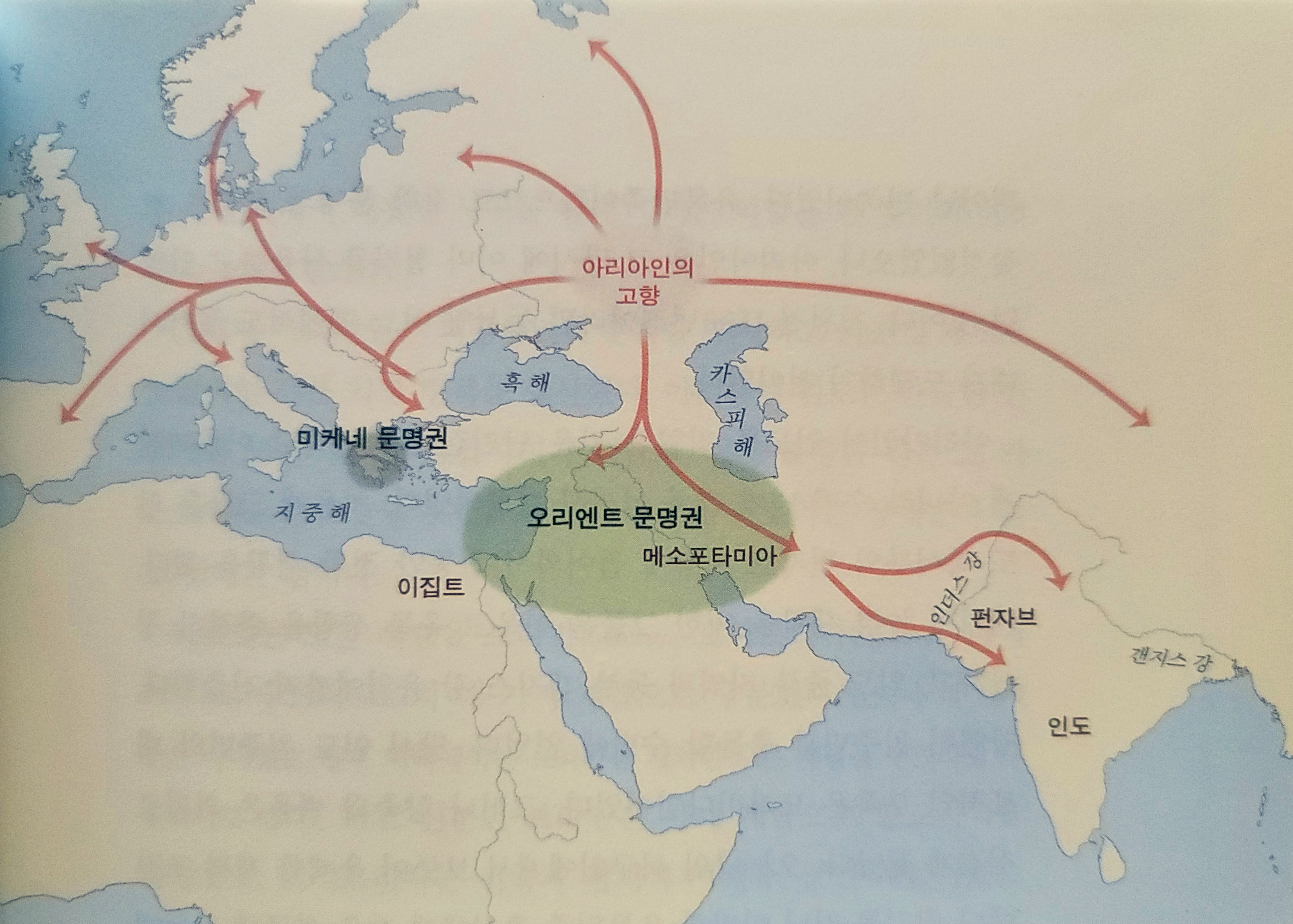 ▲ 아리아인의 이동 경로. 중앙아시아의 초원 지대가 고향인 아리아인은 일찍부터 철제 무기를 가졌던 수수께끼의 민족이다. 이들은 두 갈래로 나뉘어 하나는 서쪽의 유럽으로 이동했고, 다른 하나는 남쪽의 인도 북서부 펀자브로 왔다. 서쪽으로 간 아리아인은 터키를 지난 다음 그리스 남부 펠로폰네소스까지 남하해 그리스의 원주민들과 어울려 미케네 문명의 주역이 되었다. 그러나 기원 전 12세기에 미케네 문명을 파괴한 도리스인도 아리아인의 후예일 것으로 추측된다. 까마득한 고대에도, 느리기는 하지만 대규모 민족이동이 있었고 동서 교류도 있었다.