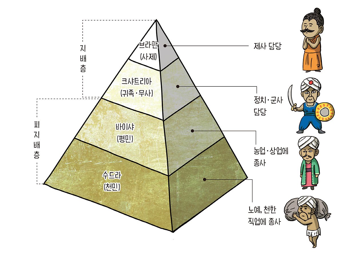 카스트는 모든 사람을 브라만(Brahman), 크샤트리아(Kshatriya), 바이샤(vaiya), 수드라(Sudra)의 네 가지 계급으로 구분했다(반드시 네 가지만은 아니었고, 일부 지역에서는 브라만을 제외한 모든 계급을 수드라로 구분하기도 했다). 최고 신분인 브라만은 사제 계급으로 종교의식을 담당했고, 크샤트리아는 귀족과 정치적 지배층, 군인 계급이었으며, 바이샤는 농업이나 공업에 종사하는 평민, 최하층 수드라는 노예 계급이었다. 이 가운데 상위 세 계급은 아리아인이었고, 원주민은 모조리 수드라였다. 즉 원주민의 최상층도 아리아인의 최하층만 못했으니 얼마나 철저한 차별 제도인지 알 수 있다.