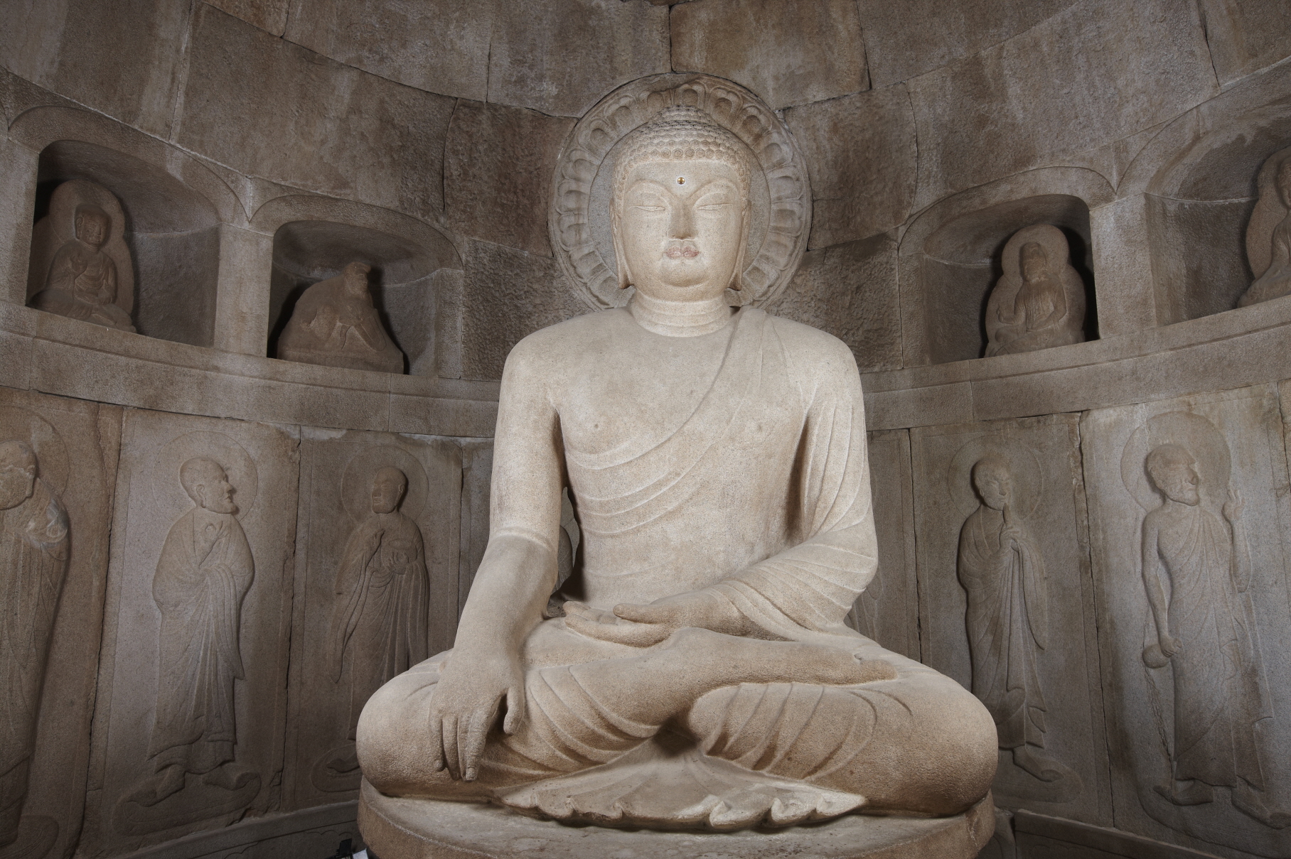 ▲ 간다라 양식. 지금까지 존재하는 고대의 모든 불상은 간다라 시대 이후의 것들이다. 헬레니즘 시대 이전까지는 불상 자체가 없었기 때문이다. 앞서의 고행하는 불상과 대비되는 이 잔잔한 모습의 불상은 간다라 양식의 특징을 잘 보여준다. 섬세하고 부드러운 옷 주름과 몸의 굴곡은 그리스 신상과 닮았다.