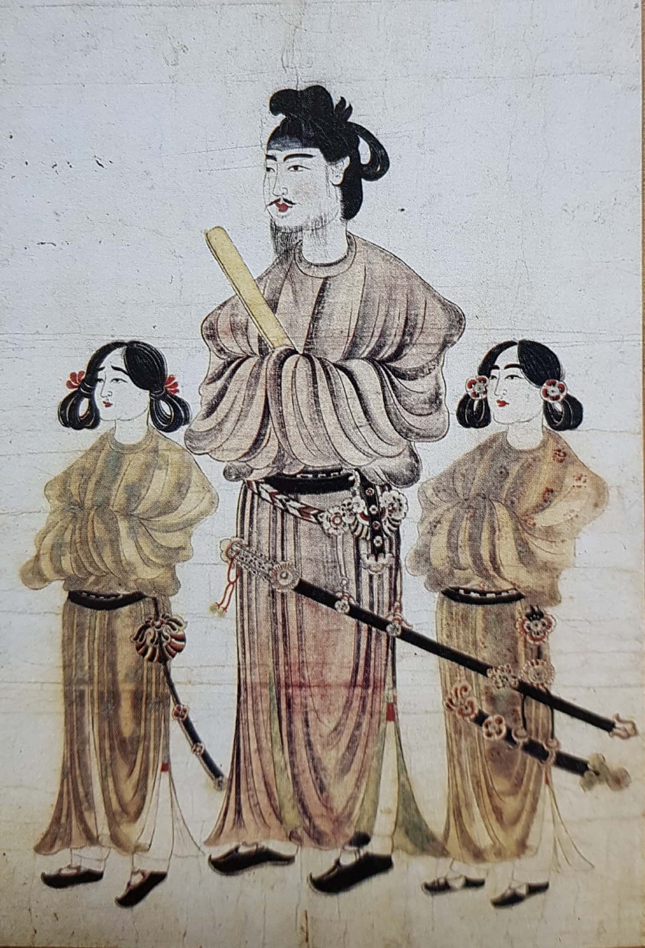 ▲ 일본의 토대를 닦은 인물. 일본 고대사의 영웅 쇼토쿠 태자의 화상이다. 양 옆에 두 아들을 거느리고 있다. 그는 당시의 실력 가문인 소가씨와 공동 정권을 구성해 일본 고대국가의 주춧돌을 놓았다.