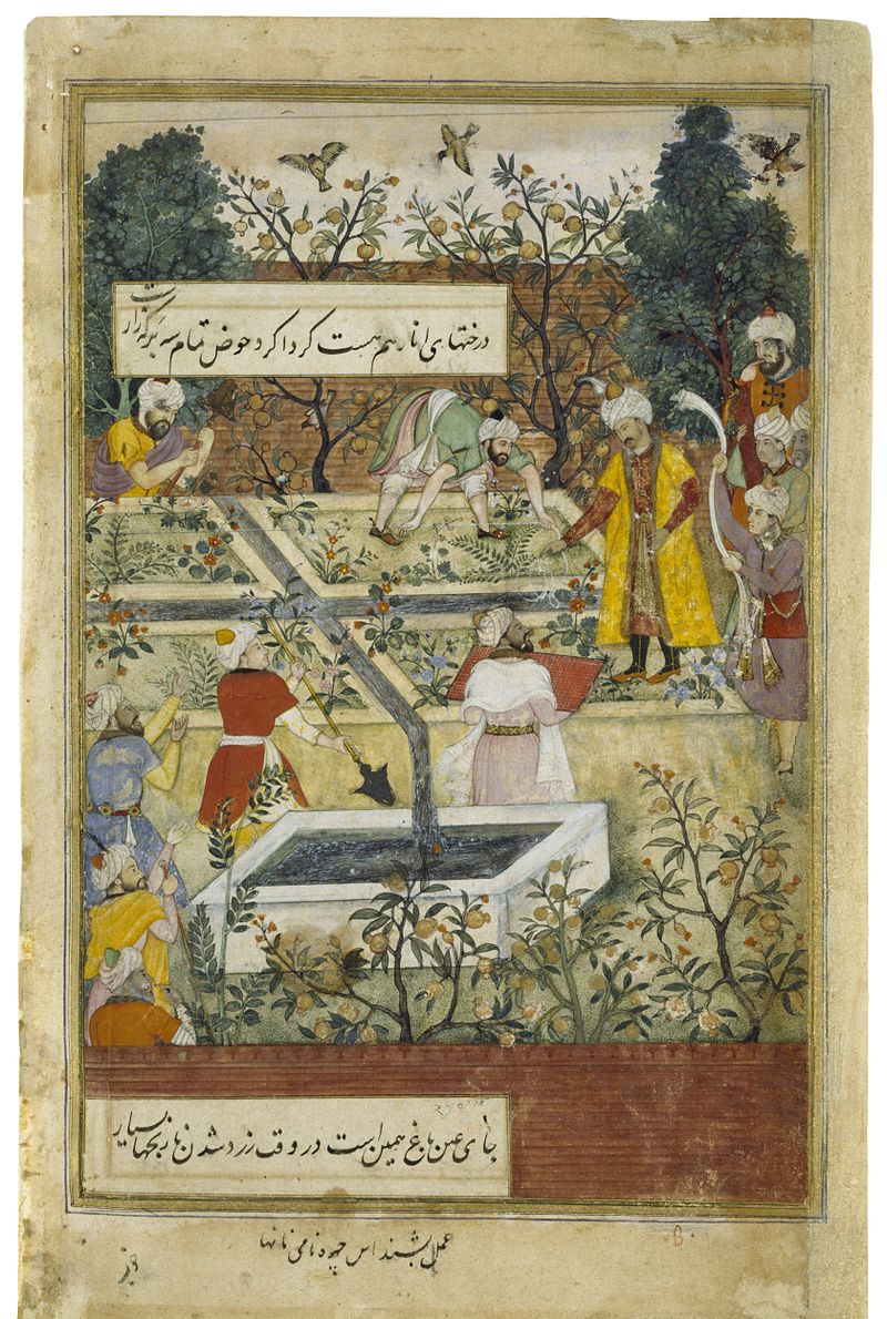 ▲ 정원을 좋아한 바부르 바부르는 아프가니스탄의 작은 왕국에서 순식간에 국력을 키워 북인도까지 정복하고 무굴 제국을 세운 흥미로운 인물이다. 무굴(Mughul)이란 바부르의 부족 이름으로서 몽골(Mongol)을 가리킨다. 그렇다면 바부르는 몽골의 후예일 텐데, 역사책에는 튀르크계라고도 되어 있다. 실상 흉노, 돌궐(튀르크), 몽골은 시대마다 이름이 달라졌을 뿐 모두 중국 북방을 고향으로 하는 민족이다. 몽골이 중앙아시아를 정복한 이후 칭기즈 칸과 티무르의 지배를 거치면서 돌궐족과 몽골족이 혼혈을 이루었는데, 무굴의 바부르는 바로 그 혼혈 출신일 것이다.