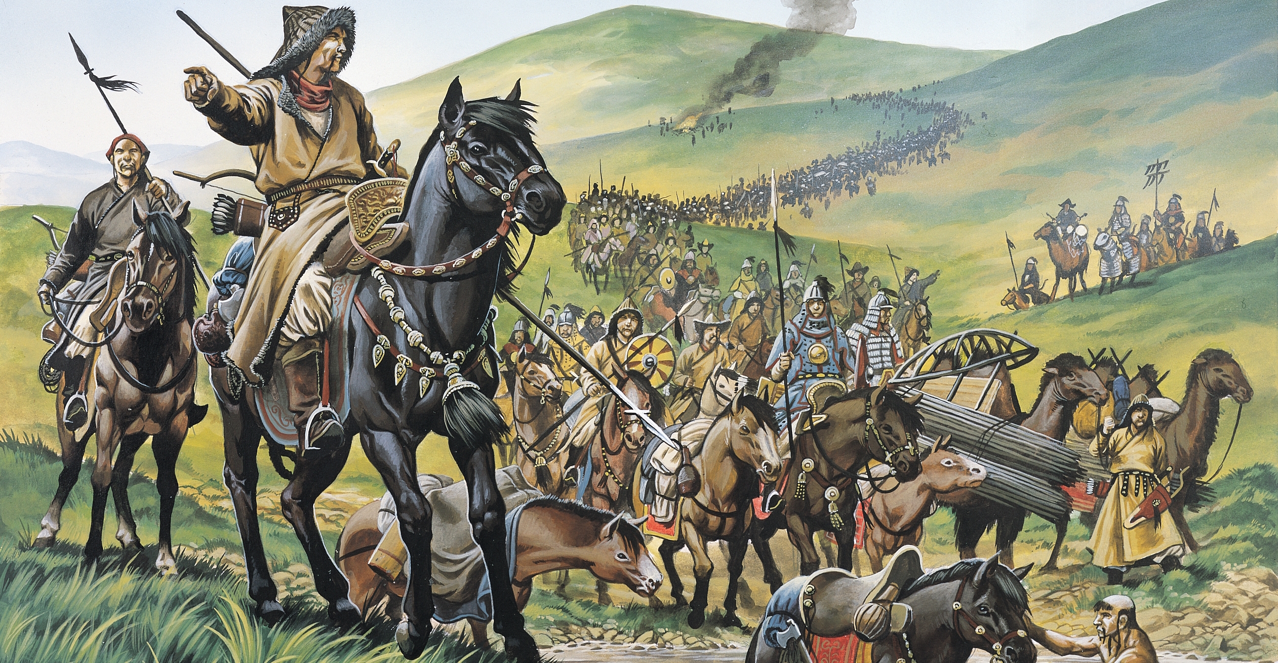 ▲ 몽골의 기병 몽골군은 유목민족답게 말을 다루는 기술이 능했다. 그들은 말 위에서 밥을 먹고 잠을 잤다고 한다. 중국의 전통적인 병법에는 보병과 기병이 분리되어 있는 데 반해, 몽골군은 모두가 기병이었으므로 뛰어난 기동력을 전투에 활용할 수 있었다.