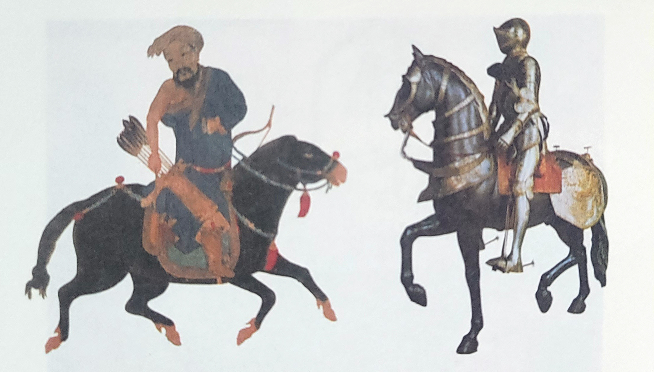 ▲ 기동성의 차이 왼쪽은 몽골군의 군장이고, 오른쪽은 유럽군의 군장이다. 몽골 병사는 말을 타고 활만 지닌 경장 차림인 데 비해, 유럽의 병사는 얼굴은 물론 손가락에까지 갑옷으로 중무장하고 말의 몸도 쇠로 둘렀다. 자신을 보호하는 데는 좋았을지 모르지만 이 차림으로는 몽골군의 뛰어난 기동성을 감당할 없었다. 장거리 원정군치고는 비교적 소수였던 몽골군에 대해 유럽인들이 동에 번쩍, 서에 번쩍했다고 기록한 것은 바로 이 때문이다.
