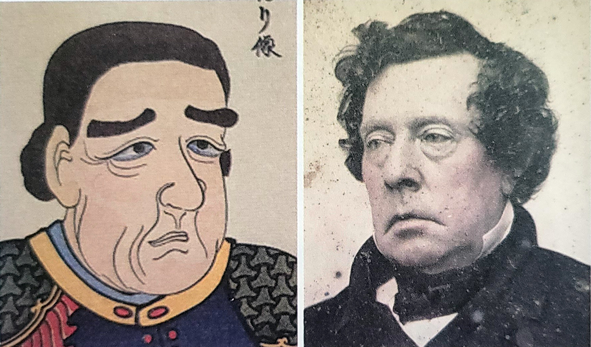 ▲ 일본인이 본 페리와 실제 페리 왼쪽은 1854년에 제작된 일본의 판화에 나온 페리 제독이고, 오른쪽은 실제 얼굴이다. 당시 일본인들은 그의 매부리코를 무척 신기하게 여겼다고 한다.