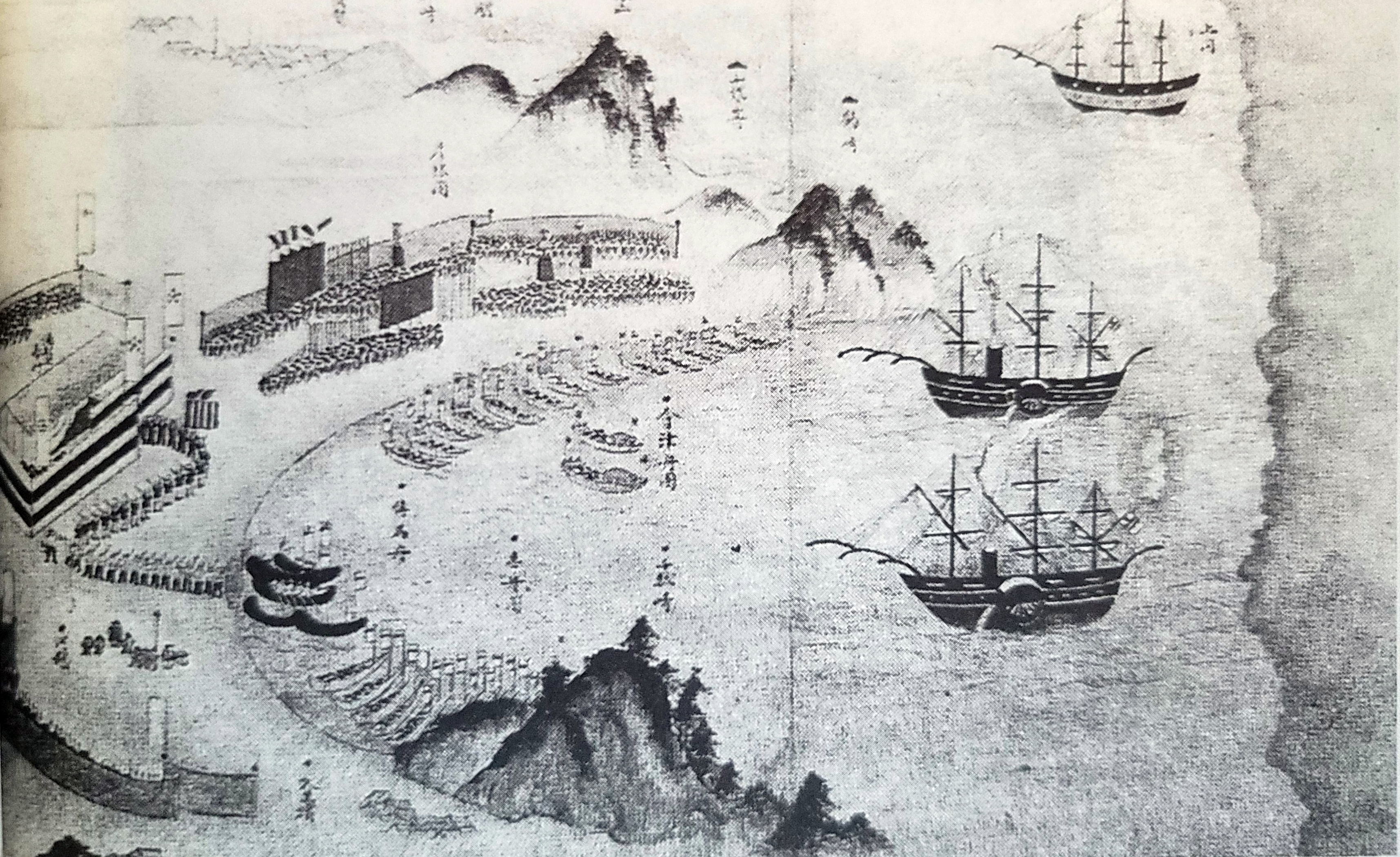 ▲ 페리의 무력시위 오른쪽의 큰 배들이 1853년 우라가에 출현한 미국의 증기군함들이다. 바쿠후는 앞서 러시아의 경우처럼 나가사키로 물러가 다시 요구하라고 했으나, 페리는 말을 듣지 않고 위협 포격을 가하면서 미국 대통령의 국서를 받아가라고 으름장을 놓았다.