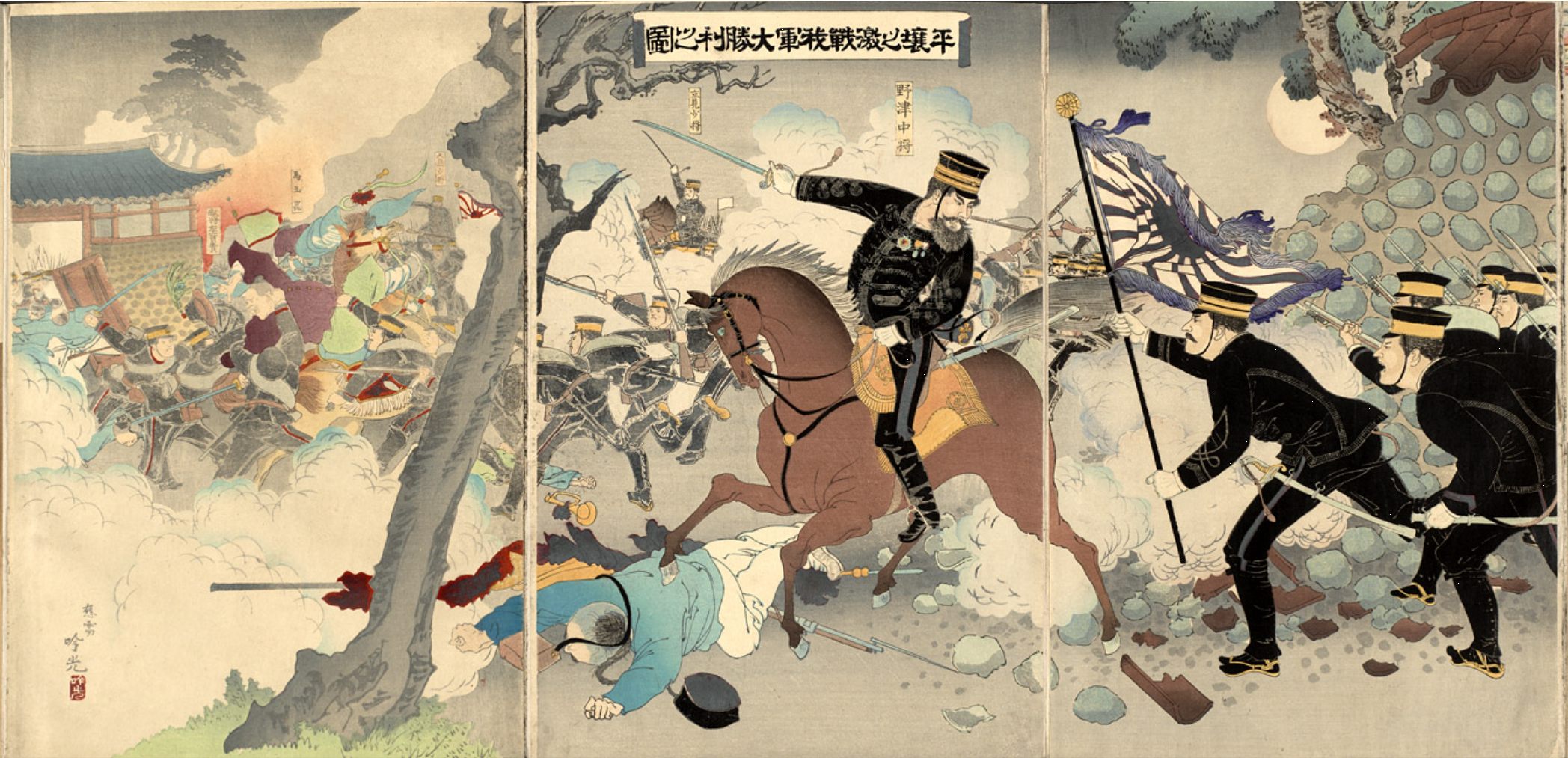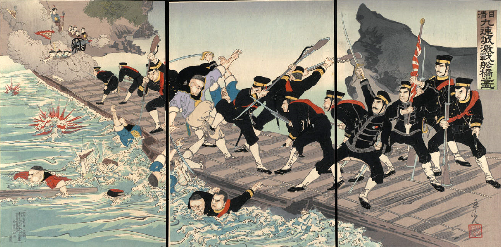 ▲ 청일전쟁 일본 측의 그림에 묘사된 청일전쟁. 전쟁을 사전에 철저히 준비한 일본은 부패하고 무능한 청나라에 압도적으로 승리했다.