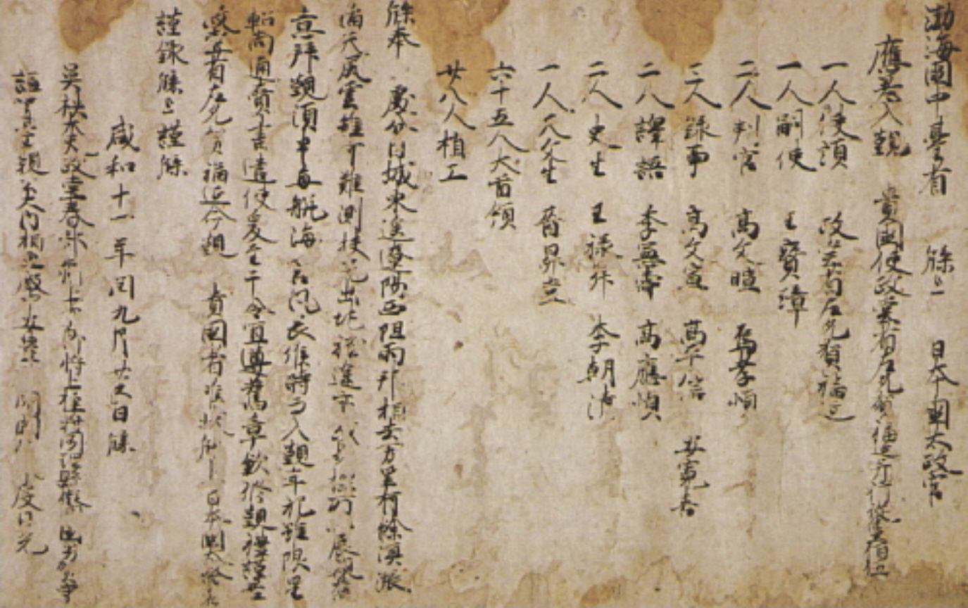 ▲ 발해가 일본에 보낸 국서 이 국서는 왼쪽의 ‘함화(咸和) 11년(842년)’이라는 문구로 연대를 알 수 있다. 이때는 이미 ‘진국’이라는 국호를 버리고 ‘발해’를 사용했다(오른쪽 맨 위).