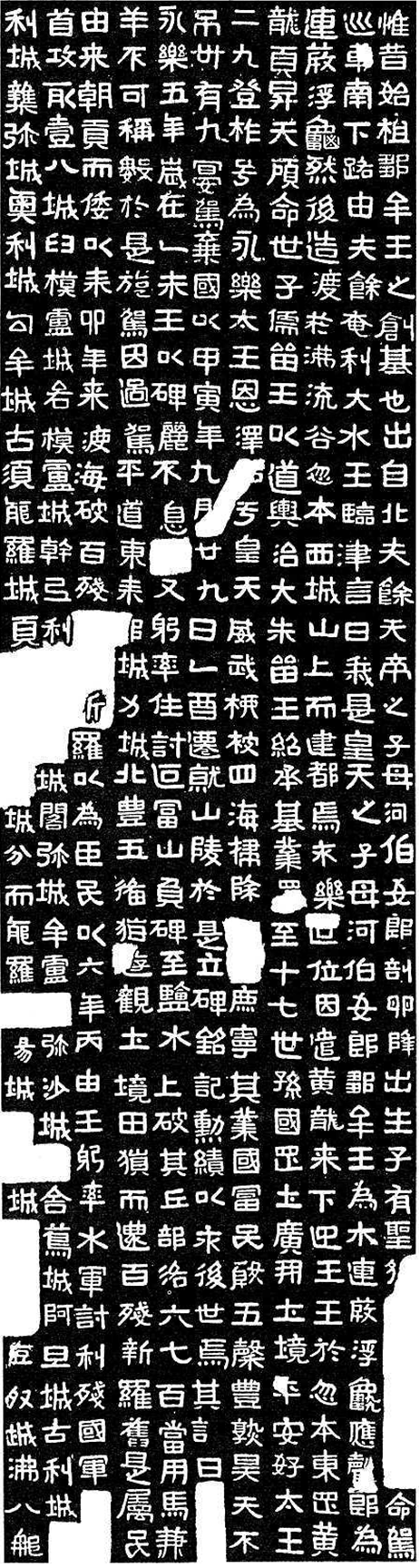 ▲ 광개토왕과 주몽에 관한 오해 정복군주라는 위명 때문인지 광개토왕(廣開土王)에 관해서는 흔히 중국을 위협한 영웅이라는 이미지가 따라다닌다. 그러나 그가 영웅이라는 데는 토를 달 필요가 없겠지만, 사실 그는 대중국 전선에 대해서는 랴오둥의 소유를 승인받는 정도로 만족했을 뿐이고 한반도 남쪽 경략에 더 관심이 많았다. 사진은 광개토왕릉비 첫 부분의 탁본인데, 오른쪽 상단에 고구려의 건국자를 주몽(朱蒙)이 아니라 ‘추모(鄒牟)’라고 새긴 것을 분명히 확인할 수 있다.