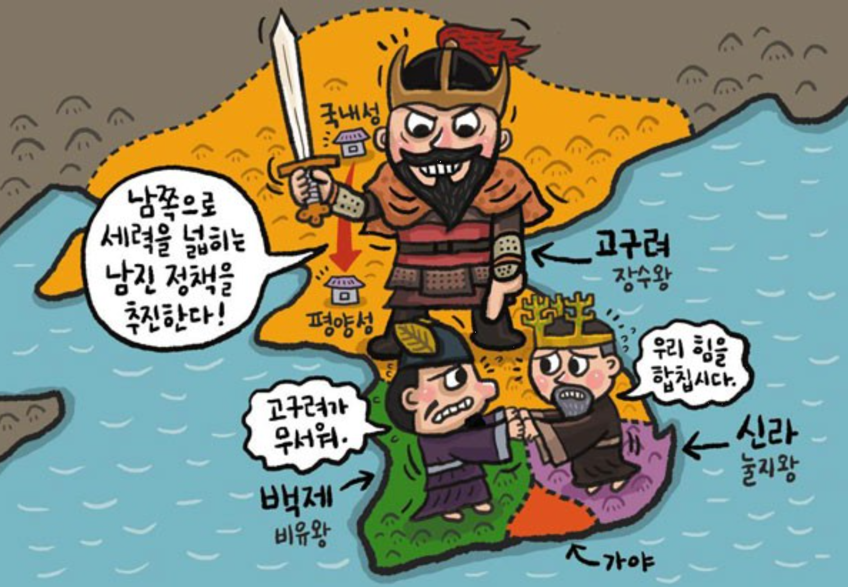 이것이 후대에 나제동맹(羅濟同盟)이라 알려진 사건인데, 가히 고대의 ‘통일전선’이라 할 수 있을 것이다. 하지만 그 배경이나 과정에서 보듯이 그것은 대등한 관계에서 맺어진 동맹이라 부르기는 어려운 것이었다. 백제는 남조의 송나라를 비롯하여 일본, 가야와 두루 연대하고 있었으니 신라와의 동맹은 그 연대의 사슬 중 하나의 고리일 뿐이지만, 신라의 입장에서는 백제만이 유일한 연대의 대상이기 때문이다(게다가 신라는 백제의 다른 파트너들과는 사귀지 못했다. 그래서 나제동맹을 맺고 나서도 신라는 일본의 대규모 침략을 당한다). 이는 당시 한반도 남부의 정세에서 백제와 신라의 위상 차이가 현격했음을 말해준다. 따라서 고구려의 타깃도 역시 신라가 아니라 백제가 될 것은 당연하다. 비록 신라가 고구려의 우산에서 벗어났지만 고구려는 동남부의 약소국인 신라에는 눈길조차 주지 않는다. 남진의 차비를 마친 장수왕(長壽王)의 일정표에는 오직 백제 정벌만이 들어 있을 뿐이다.