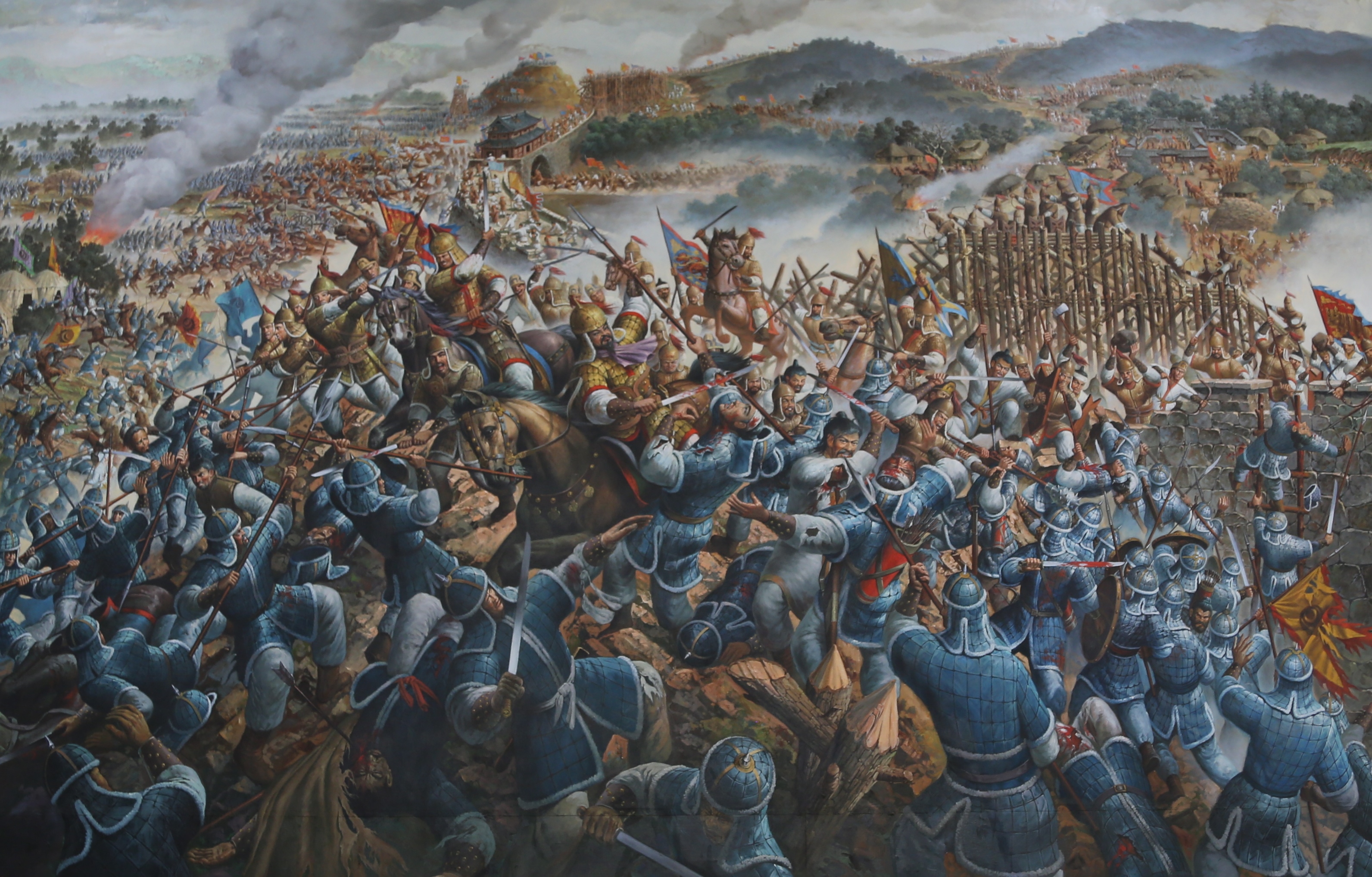 ▲ 전쟁의 승부를 결정한 전투 안시성 전투의 기록화다. 당군은 랴오둥의 거의 모든 성들을 함락시켰지만 유독 이 안시성만은 무너뜨리지 못했다. 고구려의 야전군이 궤멸한 뒤에도 양만춘이 지키는 안시성이 살아남았기에 당 태종은 또 다시 패전의 눈물을 뿌려야 했다. 그러나 안시성은 그림에서 보이는 것처럼 큰 성은 아니었을 것으로 추측된다.