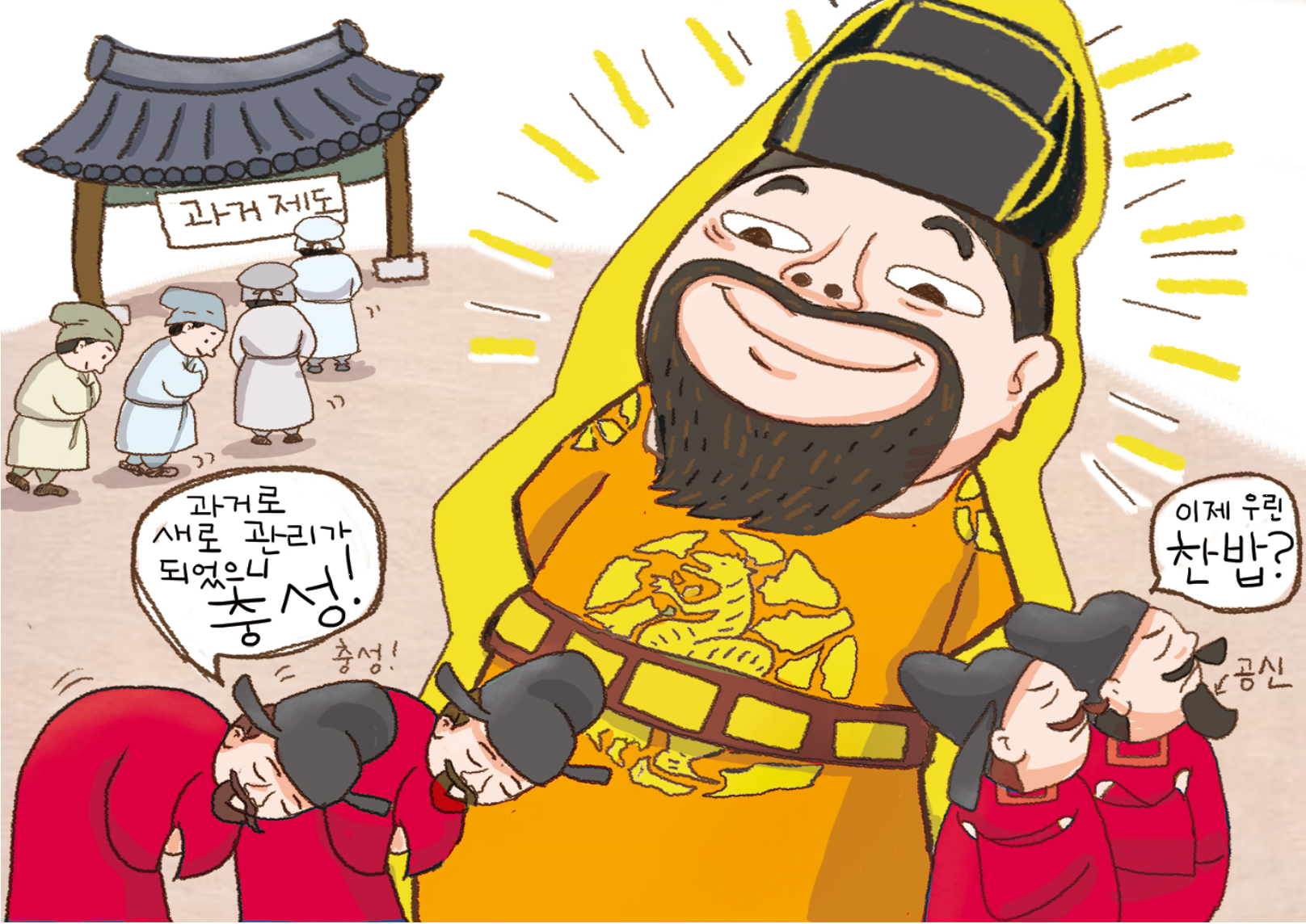 그러나 광종(光宗)의 개혁은 거기서 그치지 않는다. 호족들의 물리력은 제압했지만 지역에서 그들이 행사하는 행정력은 여전하다. 사실 치열한 왕위계승전이 끝나고 나라가 정상화된 지금에 와서는 그들에게도 군사력은 부차적인 권력 기반일 뿐이다. 그들의 실제적인 권력은 자기 마음대로 지방 관리를 임명하고 지방행정을 주무르는 데서 나온다. 따라서 그것마저 뿌리 뽑지 않으면 호족들의 세상은 여전할 것이다. 그래서 광종은 958년에 2차 개혁을 추진하는데 그게 바로 과거제(科擧制)다【오늘날 우리는 시험을 통해 인력(공무원, 학생 등)을 선발하는 방식에 익숙해져 있지만, 그래서 공부를 잘해야 성공한다는 걸 철칙처럼 여기지만, 막상 과거가 처음 실시될 때는 얼마나 낯선 것이었을까? 사실 이런 방식은 국가권력이 강력하지 않으면 생각할 수도, 시행할 수도 없는 제도다. 관리(官吏)라는 말 자체가 ‘관(官)에서 일하는 벼슬아치[吏]’라는 뜻이니까 ‘관’이 없다면 관리도 있을 수 없다. 정치적 통일 권력이 늦게 발달한 서양의 역사에서는 관이 없었기에 동양식 관리와 같은 개념도 없었다. 따라서 과거 같은 제도가 필요도 없었고 가능하지도 않았다. 서양의 경우에는 국민국가가 성립하는 17세기부터 관리와 관료제가 발달하기 시작하는데, 초기에는 주로 귀족들이 관직을 맡았으며, 18세기 시민 사회 시대에 들어서는 시민들의 ‘선출’에 의해 관리가 임명되는 방식이 자리잡는다. 그에 비해 동양 사회에서는 근대에 들어 중앙집권적 제국 체제가 무너질 때까지 과거가 가장 주요한 관리 임명제도로 기능했다. 그 후유증이 지금의 입시지옥과 각종 ‘국가고시’의 폐해라고 봐도 좋을 것이다】.