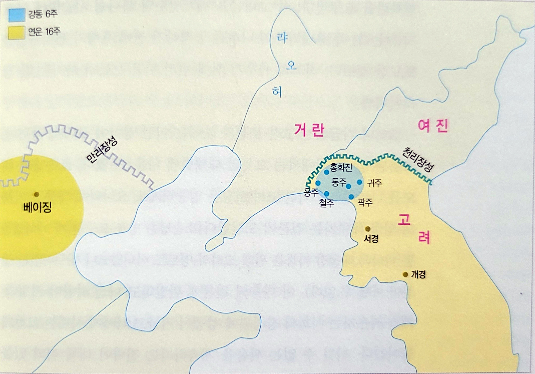 ▲ 분쟁 지역 11세기 초반 극동 3국의 쟁탈지는 중국 방면의 연운 16주와 한반도의 강동 6주였다. 서희(徐熙)가 강동 6주를 설치한 것은 외교적 성과일 수도 있지만, 실은 거란의 수에 놀아난 측면도 있다. 거란은 고려가 설사 압록강 유역까지 차지한다 해도 거란을 공격하지 않으리라고 확신했으므로 오히려 고려가 말썽많은 여진을 정복해준 게 고마웠을 것이다.