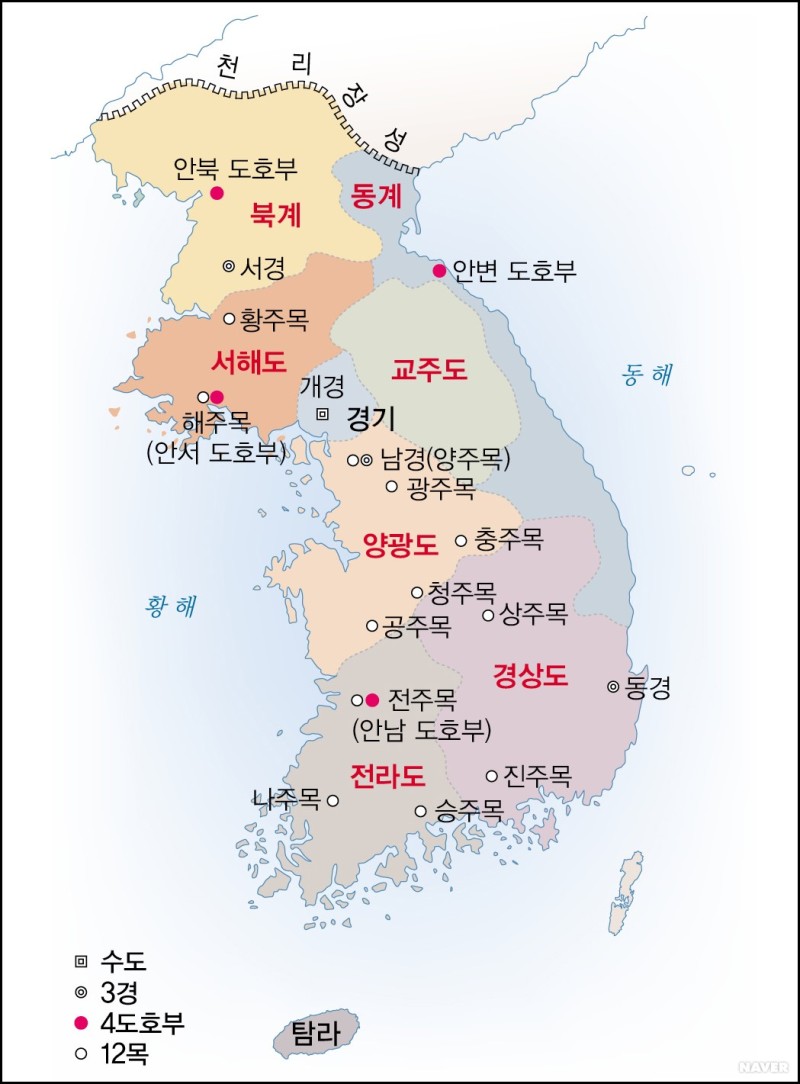대장경의 조판 이외에도 현종은 성종(成宗)이 중단시켰던 거국적 불교 행사인 연등회(燃燈會)와 팔관회(八關會)를 부활시켰으니 불교에 대한 신심이 상당히 깊었다고 볼 수 있다. 그러나 그렇다고 해서 그가 불교 국가를 구현하고자 했다고 생각하면 곤란하다. 앞서 본 최승로의 말처럼 불교는 어디까지나 도덕과 신앙의 차원에서 기능할 뿐이고, 국가 체제를 위해서는 뭐니뭐니해도 유학이 최고다(세상의 어느 군주가 유학처럼 지배자에게 매력적인 이데올로기를 거부할까?). 현종은 오히려 승려의 과대한 권한을 억제하고, 한림원(翰林院)을 두어 유교 국가 특유의 학자 관료 체제(하권 67쪽 참조)를 도모하는 한편 설총과 최치원(崔致遠) 등 유학의 위인들에 대해 공식적으로 제시를 지냈는데, 이것이 문묘종사(文廟從祀)의 시작이다(문묘란 공자의 사당을 뜻하니까 문묘종사란 유교 의례에 따른 제사를 말한다). 그러나 시대는 아직 완벽한 유학 국가가 도래하기에는 일렀고, 현종에게는 그보다 더 시급한 일이 있었다. 전란이 남긴 결과를 추슬러 고려의 지도를 다시 그려야 했기 때문이다. 어렵게 새로 얻은 북방의 영토를 포함하여 그는 전국을 5도 양계로 재편함으로써 지방행정구역을 확정했다【5도 양계란 양광도(경기도와 충청도), 경상도, 전라도, 교주도(강원도), 서해도(황해도)의 다섯 개 도(道)와 동계와 북계의 두 계(界)를 가리키는데, 양계는 물론 북변의 국방을 위해 군사적 목적으로 편성된 단위다. 이렇게 지방행정구역이 변경되면서 성종 대의 12목도 8목으로 줄었다. 그 과정에서 중앙집권화는 한층 진척되었으나 앞서 말했듯 지방관이 파견된 주현보다 속현의 수가 많은 현상은 고려 말까지 계속된다. 그런 점에서 고려시대는 내내 조금씩 중앙집권화 작업이 이루어진 시대라고 할 수 있다. 5도 양계의 행정구역은 고려 말까지 유지되다가 조선시대에 들어 1413년 태종이 전국을 우리에게 익숙한 8도로 재편하게 된다】.
