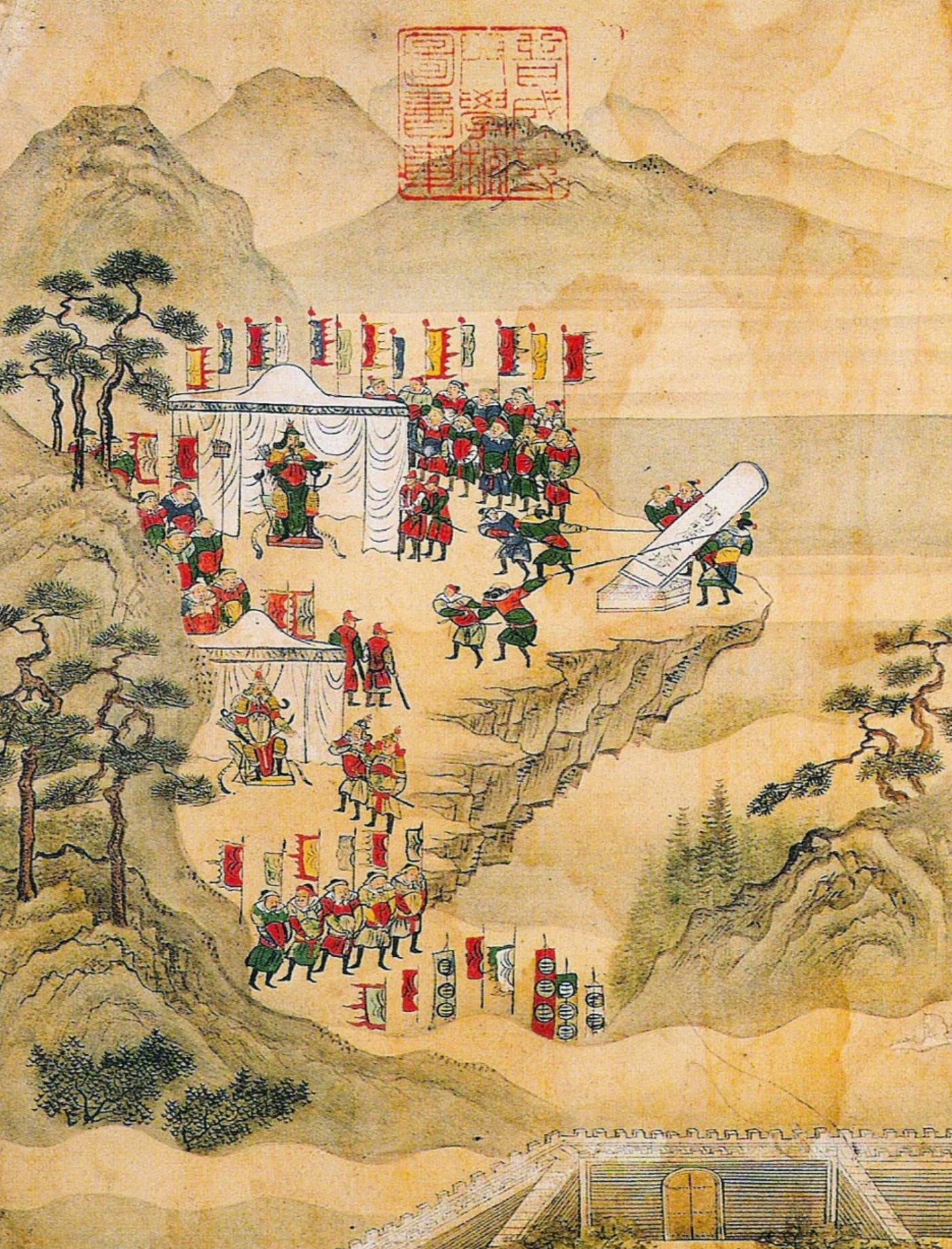 ▲ 욕만 먹은 영토 개척 한창 기세가 뻗어나는 여진을 상대로 완승을 거둔 윤관은 귀환길에 오르면서 내심 포상을 기대했으리라. 그러나 그에게 돌아온 것은 왜 쓸데없이(?) 영토를 개척했느냐는 개경 귀족들의 핀잔이었다. 그림은 윤관이 9성을 쌓고 기념비를 세우는 장면을 담은 기록화인데, 아마 성 쌓기에 동원된 고려 백성들도 나중에 반환할 줄 알았더라면 그렇게 열심히 일하지 않았을 것이다.