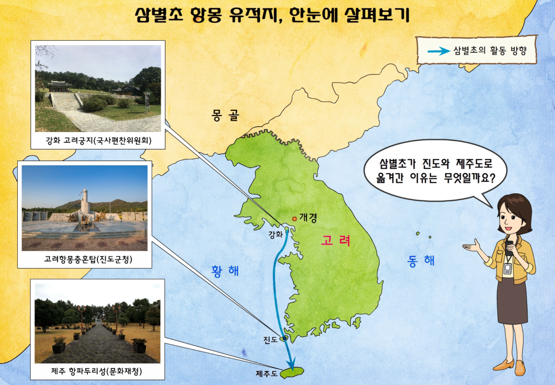 애초에 배중손이 믿었던 것은 미처 강화도에서 나오지 못한 왕족과 귀족들이었다. 그러나 그가 왕족인 승화후 온(溫)을 왕으로 옹립하는 등 부산 떠는 틈을 타 인질들은 재빨리 육지로 도망쳐 나온다. 그렇다면 삼별초(三別抄)도 더 이상 강화도에 머물 이유가 없어졌다. 그래서 그들은 배를 타고 멀리 남쪽으로 가 진도에 근거지를 트는데, 그들이 기세를 떨치는 것은 이때부터다. 선박을 이용한 기동력을 바탕으로 순식간에 제주도에서 거제도까지 남해상의 섬들을 점령하니 옛 장보고(張保皐)가 부럽지 않다. 특히 항구들을 장악하고 중앙으로 가는 조운을 방해한 것은 개경 정부에게 심각한 재정적 타격을 준다. 그대로 놔두었다가는 반란이 아니라 또 다른 나라의 건국이 될 판이니, 개경 정부는 장보고 시대 경주 정부의 심정이 어땠을지 공감할 수 있었다.