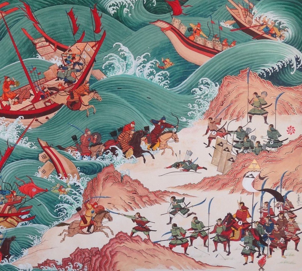 ▲ 몽골에 맞선 일본 세계를 정복한 몽골군이 쳐들어온다는 소식에 일본 전역이 몸을 떨지 않을 수 없다. 그러나 전란을 피해 강화도로 달아난 고려의 무신정권과 달리 일본의 동업자는 과감히 몽골군에 맞섰다. 물론 강력한 몽골 기마병이 아니었기 때문이기도 하지만, 그것은 일본이 중국에 사대하지 않고 독자적인 황제(천황)를 모시는 독립국이라는 자세가 있었기에 가능했다. 그림은 그 전투 장면인데, 이 선박은 고려 백성들이 건조했다.
