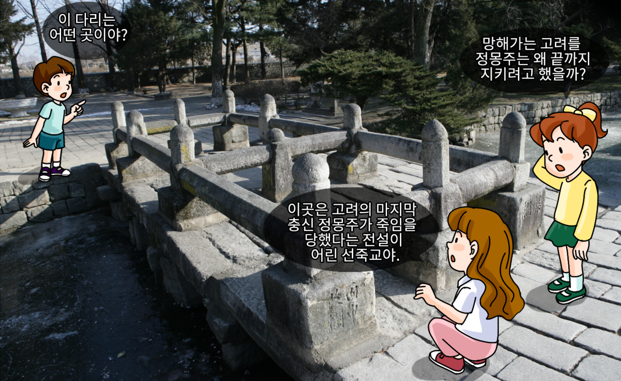 ▲ 충신의 피 마지막까지 고려를 구하기 위해 애쓴 정몽주(鄭夢周)는 이 선죽교에서 이방원이 보낸 자객에게 피살되었다. 이미 고려 왕실은 사망선고를 받았으므로 설사 정몽주가 죽지 않았다 해도 고려의 멸망은 막을 수 없었겠지만, 그래도 ‘신군부’에 용감히 맞선 그의 저항은 1979년 쿠데타 세력에게 순순히 정권을 내주고 이후에도 침묵하다가 끝내 비밀을 안고 죽은 어느 대통령을 부끄럽게 만든다.