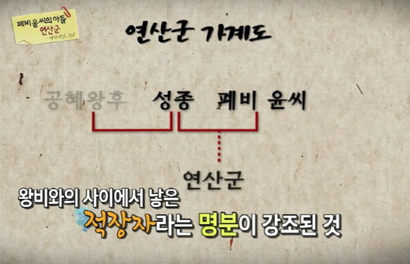 어머니가 죽은 이듬해인 1483년에 연산군(燕山君)은 세자로 책봉되었다. 아직 일곱 살밖에 되지 않은 그에게 ‘어른들의 부끄러운 이야기’를 상세히 전할 필요는 없었을뿐더러 장차 왕위를 계승할 세자에게 자신의 생모가 겪은 비극을 알게 할 필요도 없었다. 그래서 이 사건은 비밀에 부쳐졌으나 실은 공공연한 비밀이었으니 연산군이 과연 진정으로 모르지는 않았을 것이다. 그가 이상 성격을 지니게 된 데는 필경 생모의 그런 운명에서 받은 영향이 컸으리라.