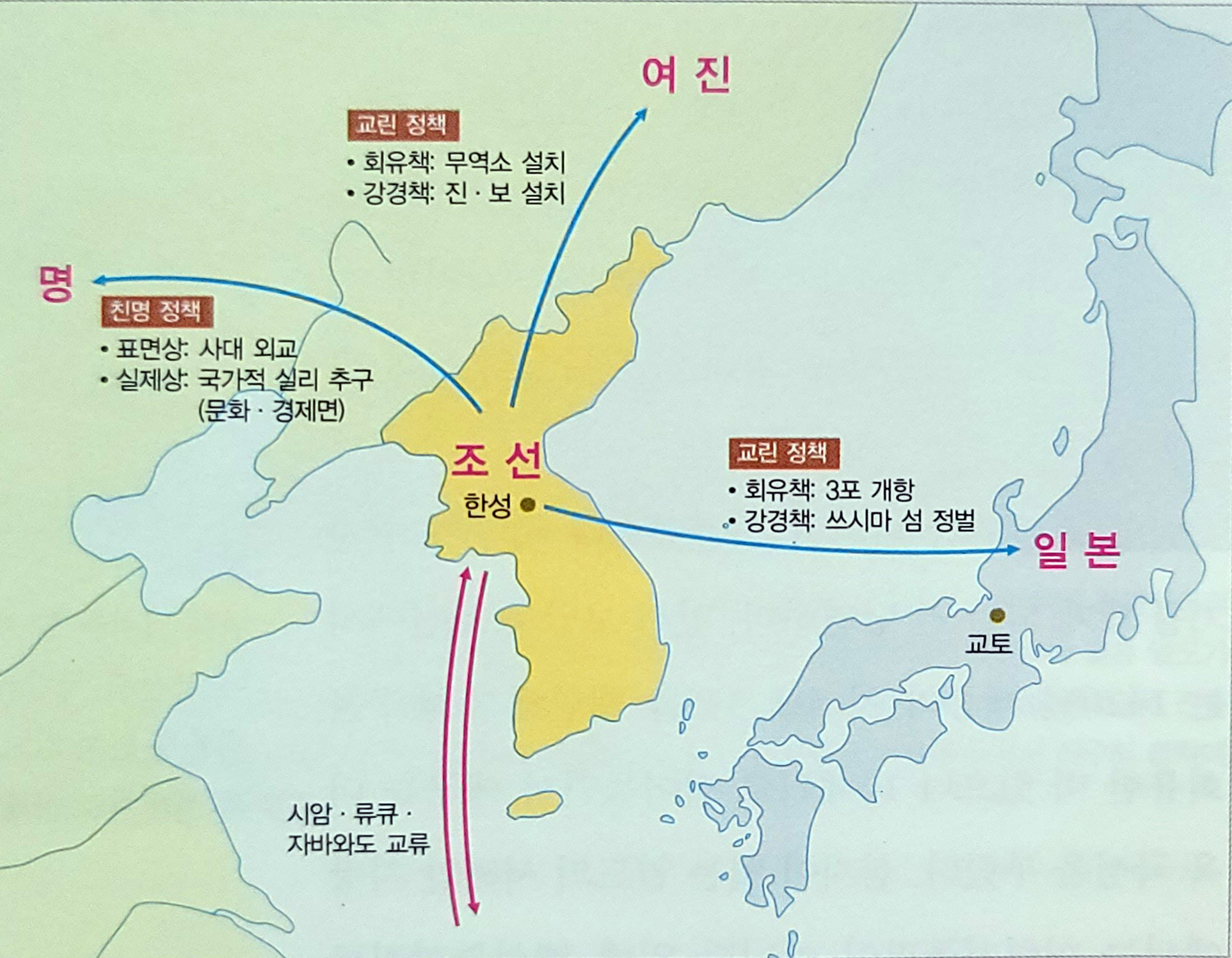 ▲ 사대교린의 줄타기 한반도는 지정학적 위치상 중화세계와 비중화세계의 접경에 있었다. 그래서 중화세계와는 사대, 비중화세계와는 교린을 대외정책의 기본 노선으로 삼았는데, 이질적인 두 세계를 제대로 매개하기에는 역량이 부족했다. 지도는 조선 초 두 세계를 상대로 한 어려운 줄타기 외교를 보여준다.