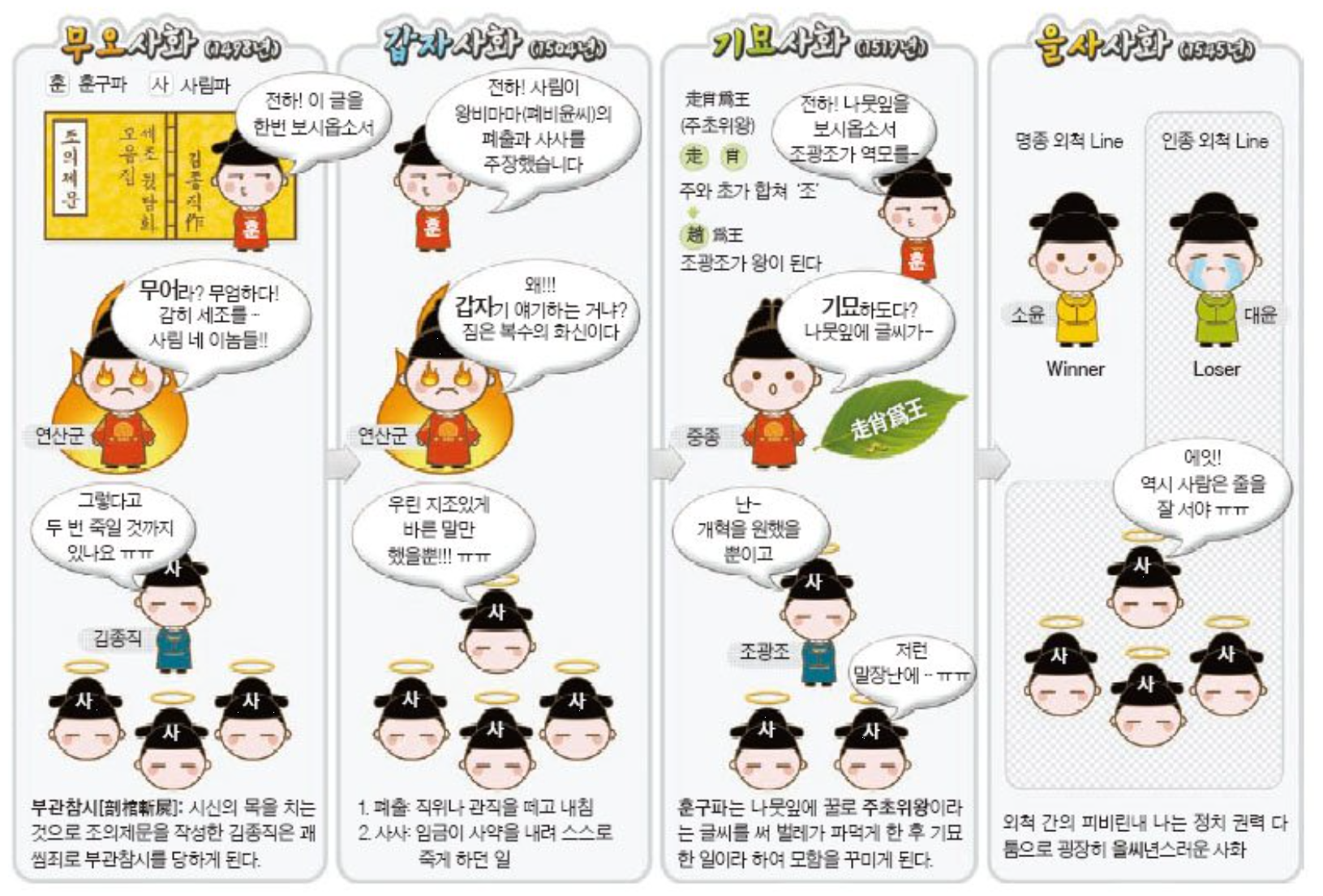 영리하고 유능한(?) 음모가만 있으면 ‘말만의 역모’로 반대파의 수많은 인물들을 떼죽음으로 몰아넣을 수 있을 정도로 조선의 병은 깊어졌다. 이런 사건을 사화(士禍)라고 부르니까 뭔가 그럴듯해 보이지만 실은 용어를 만들어 붙이기도 낯부끄러울 만큼 한심한 현상이다. 그러나 그런 황폐한 시대는 이제 시작에 불과하다.