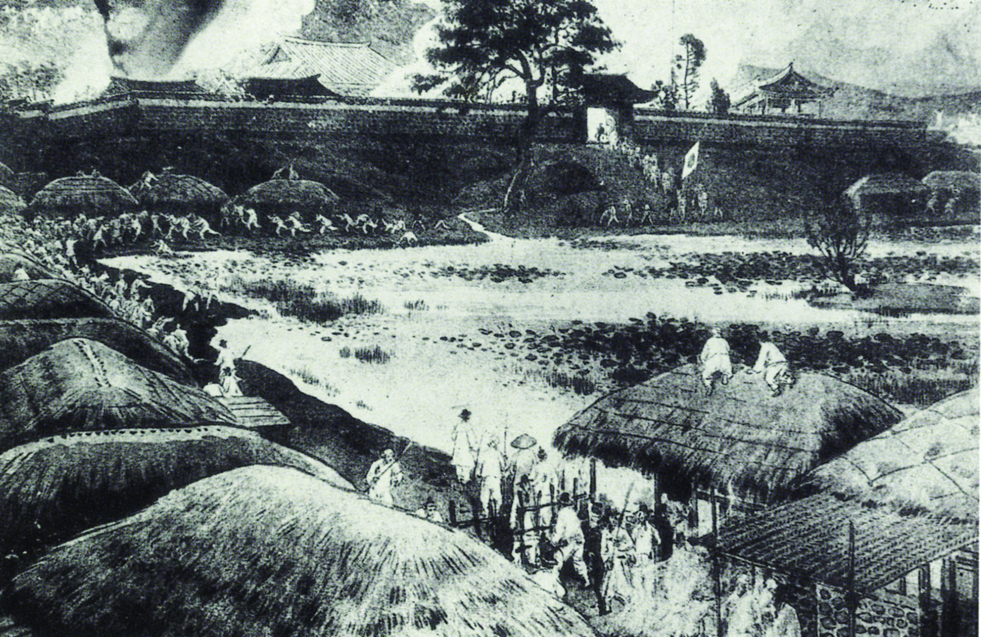 ▲ 달아나는 일장기 국제무대에 데뷔한 조선은 당연히 모든 면에서 미숙하다. 구식 군대가 차별 대우에 분노해서 반란을 일으킨 것까지는 괜찮지만, 남의 나라 공사관을 때려부순 것은 무지의 소치라고 할 수밖에 없다. 사진은 일본공사 일행이 일장기를 들고 황급히 인천 방면으로 빠져나가는 장면인데, 이게 빌미가 되어 조선은 또 다른 불평등조약을 맺어야 했다.