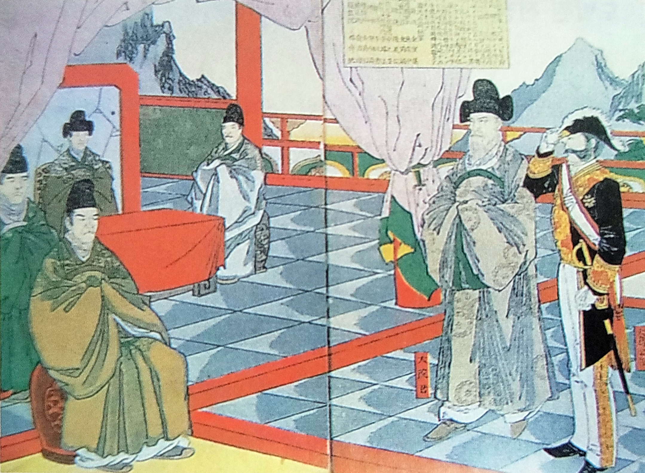 ▲ 알현인가, 시위인가? 고종(高宗)을 알현하는 오토리 게이스케(맨 오른쪽 인물)의 자세가 사뭇 거만해 보인다. 육순 노인이었던 그는 전 해에 신병으로 귀국했다가 동학농민운동(東學農民運動)이 일어나자 즉각 조선으로 달려왔다.