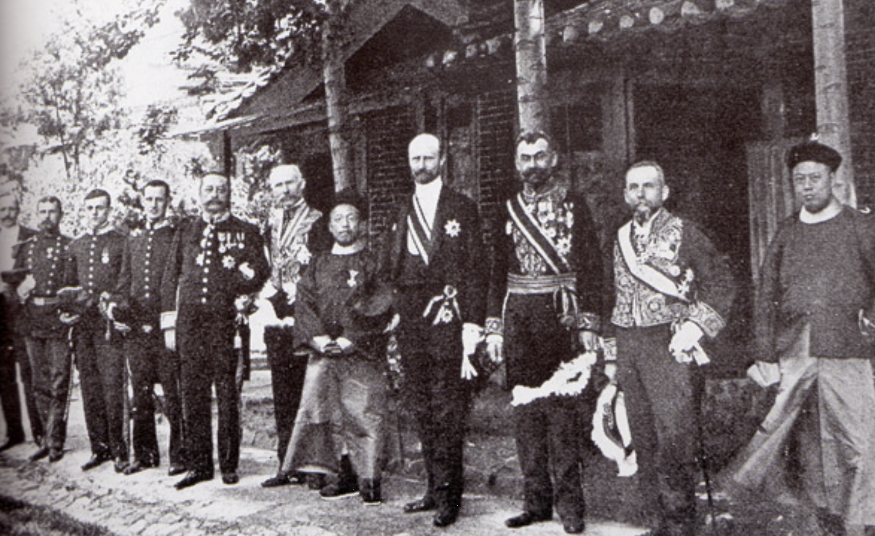 ▲ 바빠진 공사들 만주에서 러일전쟁이 한창이던 1905년 서울의 각국 공사들도 바빠졌다. 사진은 미국 공사관에 모인 각국 공사들이다. 가운데 키가 가장 큰 공사와 가장 작은 청나라 공사가 나란히 서 있는 모습이 재미있다.