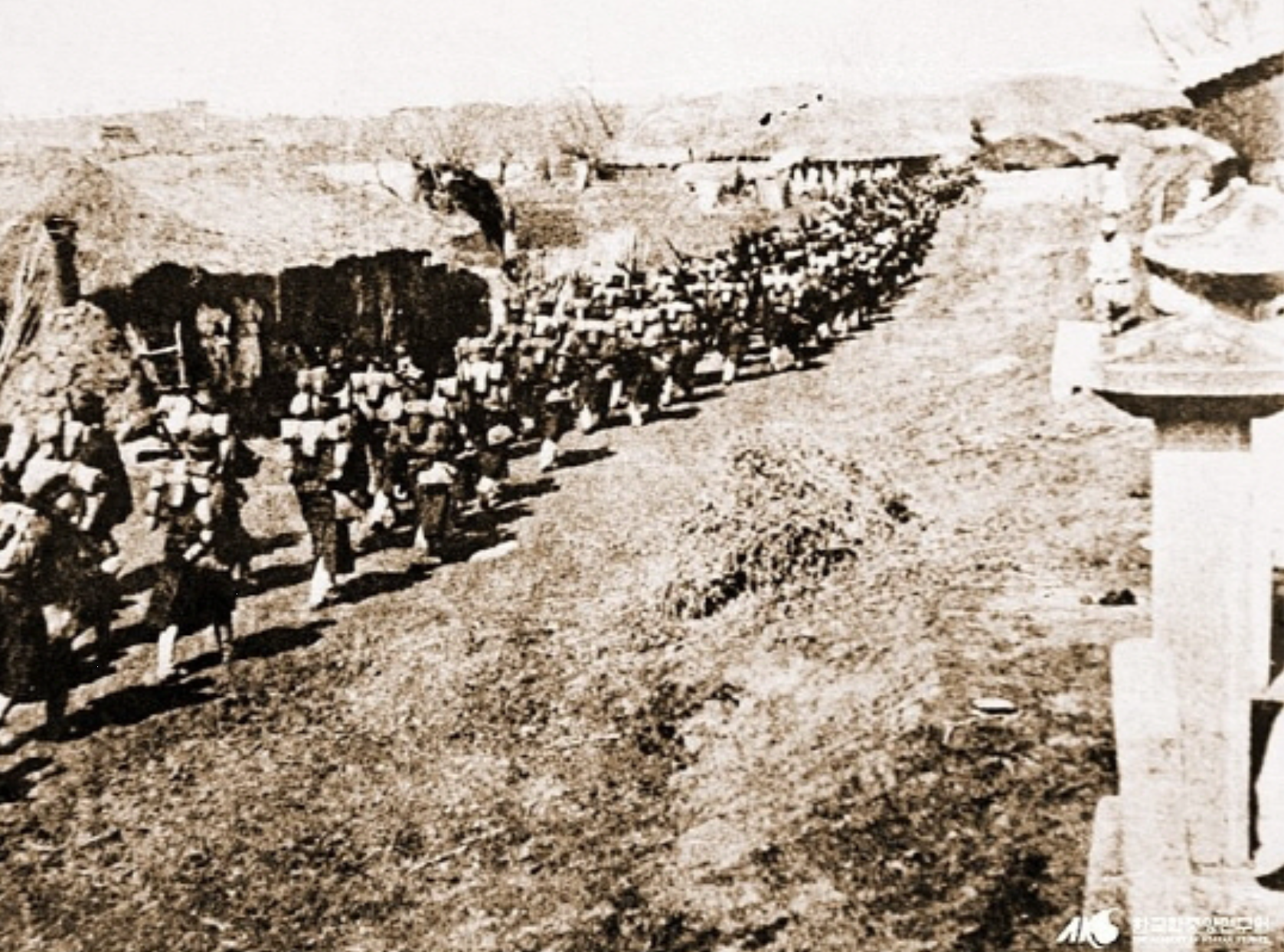 ▲ 북으로 북으로 러일전쟁에서 일본이 승리하리라고 믿는 사람은 거의 없었다. 그러나 때마침 러시아에서 일어난 혁명으로 일본은 극동에서 러시아를 물리치고 결승전에서 승리하여 조선을 전리품으로 얻게 되었다. 사진은 만주로 진격하기 위해 평양 부근을 지나고 있는 일본군의 행진 모습이다.