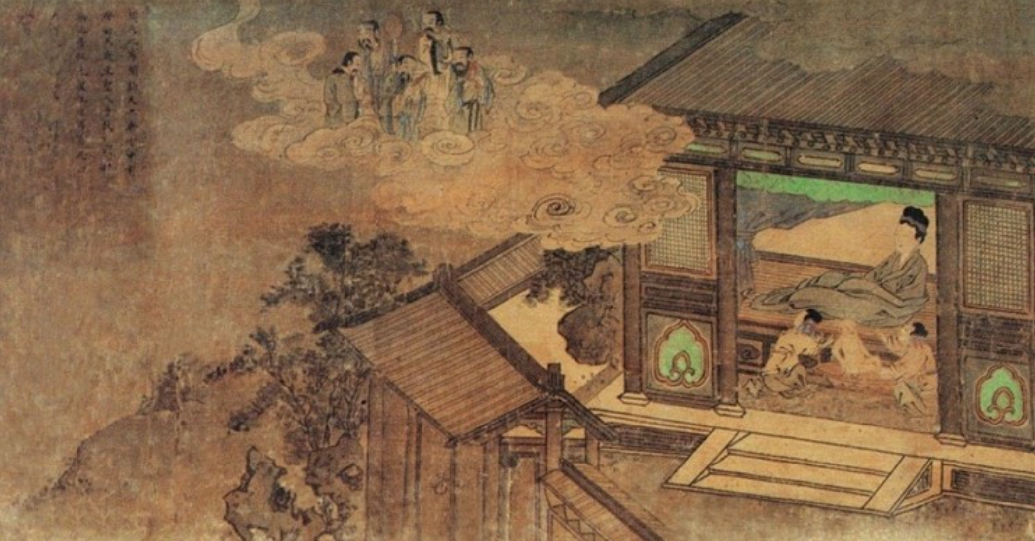 孔子出生時, 顔氏在房中聽到天上的音樂聲.