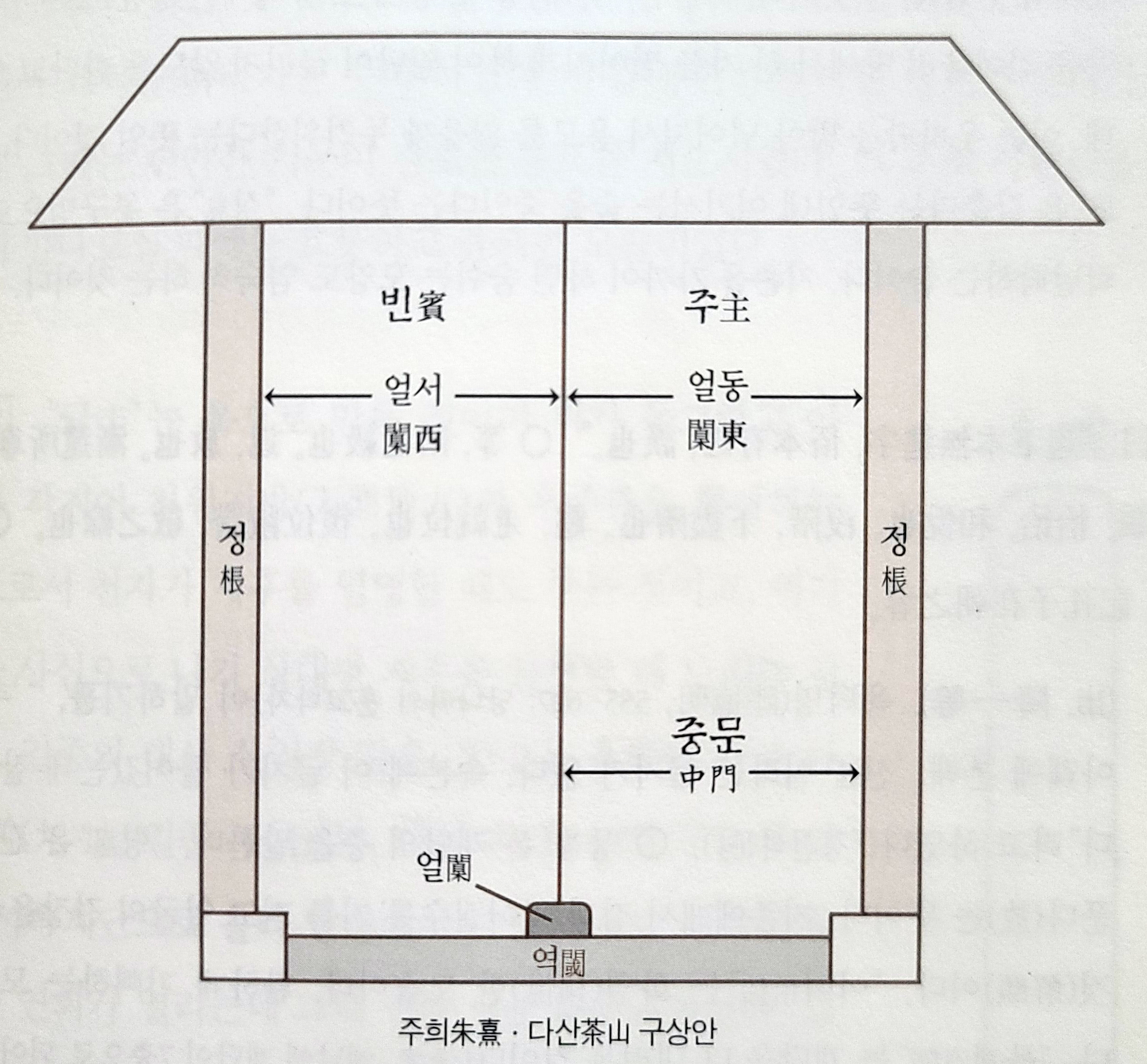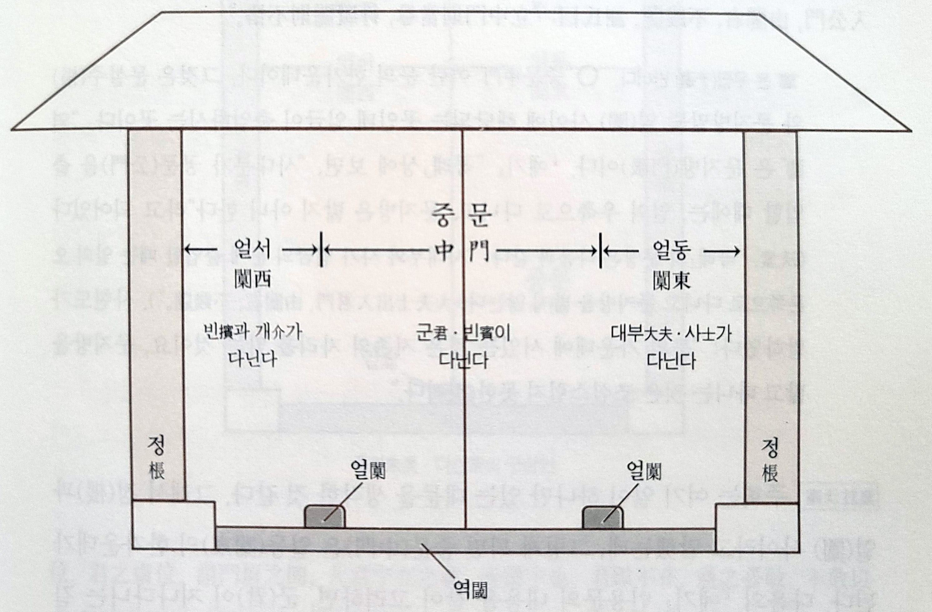 그러나 다산은 철저히 얼이 하나만 있는 문을 모델로 해서 생각하고, 임금과 신하가 같이 얼동(闑東)으로 출입하고, 이웃나라의 임금이 오면 빈(賓)인 그는 얼서(闑西)로 출입한다고 했다. 신하가 얼동으로 출입하는 것은 빈례(賓禮)를 자처할 수 없기 때문이라 하였다[人臣由闑右者, 不敢自居以賓禮也]. 그러니까 다산에 의하면 중문(中門)이란 대문의 한가운데가 아니라 얼동(闑東)의 한가운데가 된다.