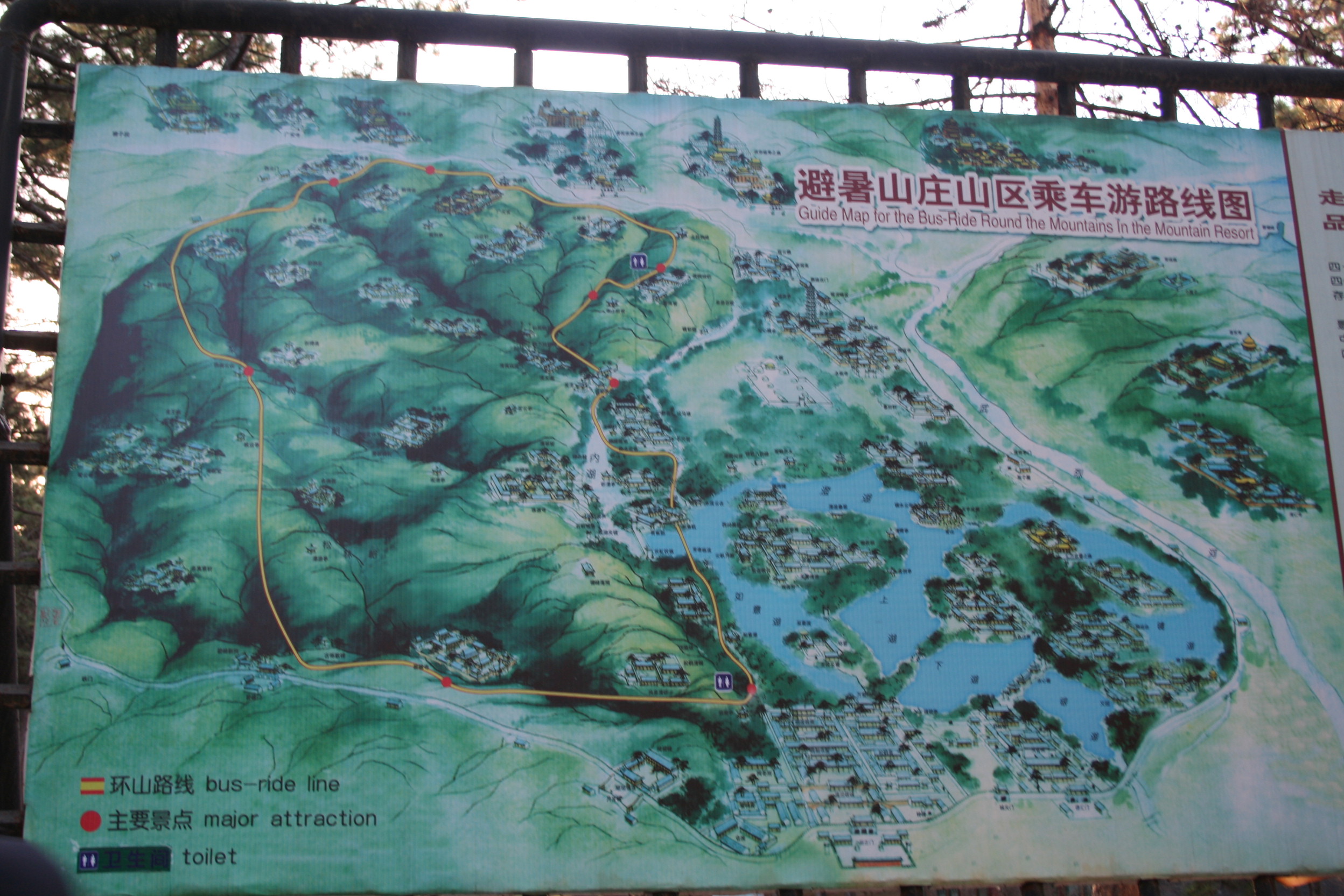피서산장은 거대한 인공호수다. 호수 곳곳마다 근사한 누각과 정자가 세워져 있다. 배를 타고 1시간쯤 돌아야 ‘전모’를 볼 수 있다고 한다. 물론 뱃삯도 장난이 아니다. 그래서 우리 일행은 먼 발치에서 주욱 둘러보는 것으로 만족해야 했다. 놀랍게도 호수 한귀퉁이에 ‘열하’가 있었다. ‘열하 속의 열하’라? 밑에서 뜨거운 물이 솟아 겨울에도 물이 얼지 않는다고 해서 열하란다. 그 물에 손을 씻으면 도박에서 큰 돈을 딴다는 전설이 있다길래 우리들은 모두 정성껏 손을 씻었다. 결과는? 아는 바 없다.