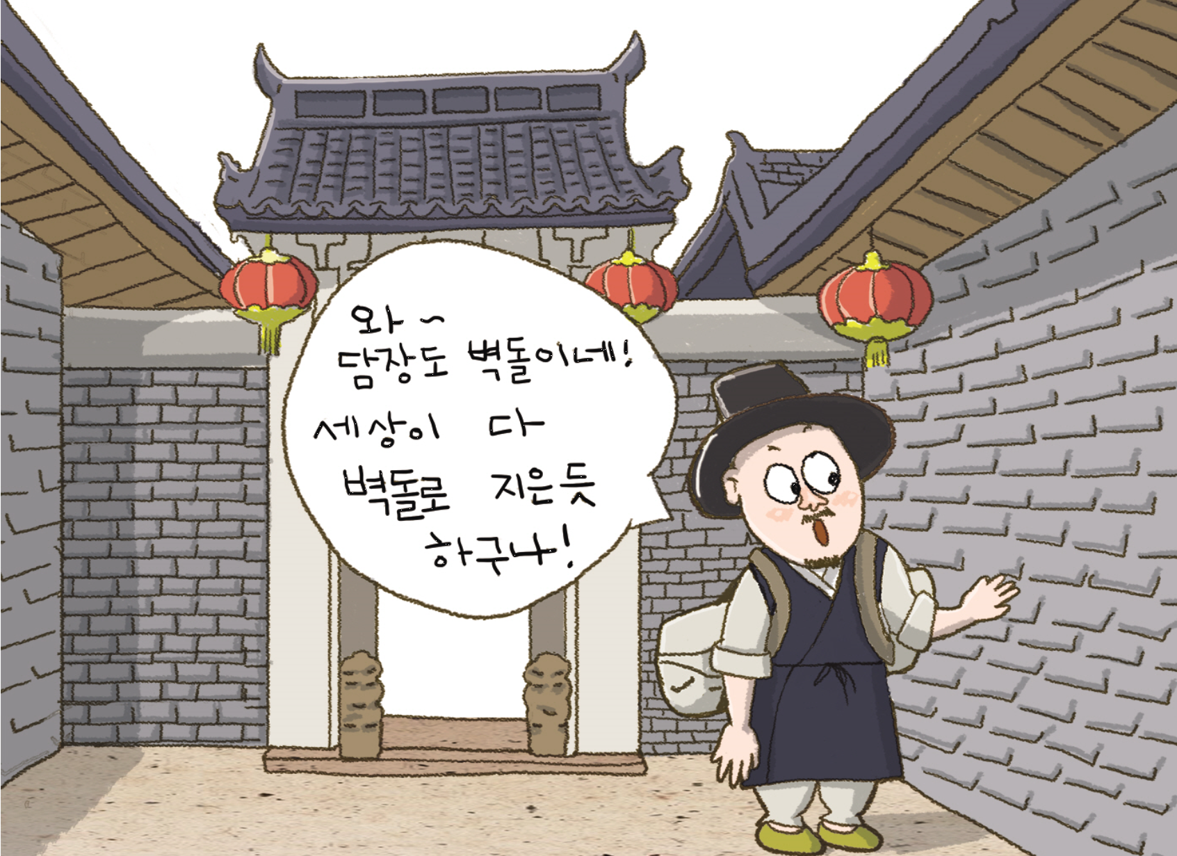 한낮 불볕이 내리쬐는 탓에 숨이 막혀 더 오래 머물 수가 없어서 결국 길을 떠났다. 정진사와 앞서거니 뒤서거니 하다가, 정진사에게 중국이 성을 쌓는 방식이 어떻더냐고 물었다. 정진사가 대답한다. “벽돌이 돌만은 못하겠지요.” “자네가 몰라서 하는 말일세. 우리나라는 성을 쌓을 때 벽돌을 쓰지 않고 돌을 쓰는데, 이건 좋은 계책이 아니야. 일반적으로 벽돌이란(길게 이어지는 벽돌론)” (중략)