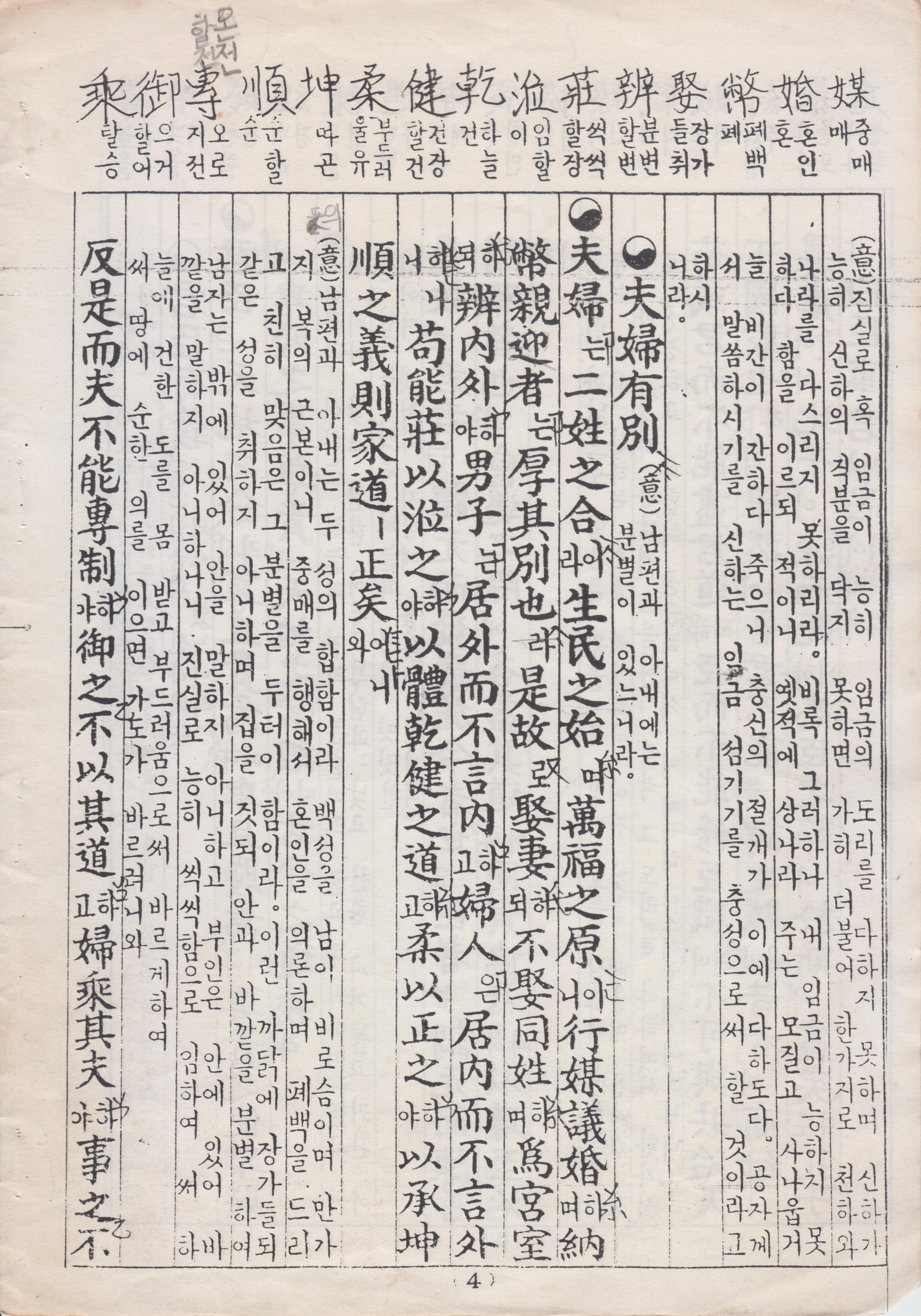 夫婦 二姓之合 生民之始 萬福之原 行媒議婚 納幣親迎者 厚其別也 是故 娶妻 不娶同姓 爲宮室 辨內外 男子 居外而不言內 婦人 居內而不言外